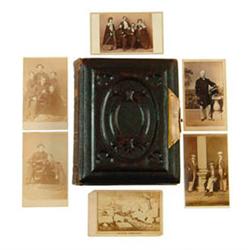 RARE & IMPORTANT CUSTER FAMILY PHOTOGRAPH . ALBUMIt is rare for any personal effects of General Custer, or his relatives, to come to market today, which makes this recent discovery a great find. This desirable leather-bound photograph/CDV album with numerous photographs and tintypes comes from the Kendall family. The photographs in the front of the album are primarily of the Richardson/Kendall family, and two of them feature Custer, and one, his wife Libby. Rebecca Richmond and Mary Richmond Kendall were Elizabeth Custer’s cousins and were very close to her. Mary’s husband Charles Kendall, featured in 3 of the photos was from Michigan and served in several Michigan cavalry units during the Civil War, and was a friend of Custer’s. One formal-looking pose features all five of these people, and another from the same sitting in Leavenworth Kansas shows the Kendall couple alone. Another group photo from Lexington KY shows a figure we believe to be Custer with two couples in a studio pose. The sitters all have very serious expressions, although the ladies are wearing hats and checkered scarves. The figure we believe to be Custer has his hair flipped out rather comically, and he appears to have stuffed a pillow into the front of his waistcoat. Custer was very fond of photography, and there are a number of photographs of him in costumes or humorous tableaus, so this photo may be of a similar vein. The very first photo in the album is of a distinguished gentleman with top hat and cane, whose features are not dissimilar to those of the Richmond ladies, possibly their father. There are 8 or so CDV photographs of military men in uniform, one of whom is identified on the reverse in period ink as: “Lieut. Bolza, killed in the battle of “Falling Waters” July 1863”. Another CDV of three young men is identified on the reverse in period ink as: “Thomas Mitchell, Charlie Kendall, John Morin, Grand Rapids 1861”. There are 8 or so unidentified tintypes in the album, as well as a litho of the Lincoln family, and an anti-southern CDV depicting a Southern graveyard with scathing epitaphs on the tombstones. One of the tintypes appears to be one of the Richmond sisters. The consignor originally purchased this album from “Antiques and Art” with the understanding that it came directly out of the Kendall family. The album is 6-1/2” x 5-1/4” x 2” overall. It is nicely bound in leather embossed in gold on the spine “Album” and “12”. It is fitted with a simple brass clasp. CONDITION: There are tears to some photo pockets. The photos are overall in very good condition. The interior cloth spine has split in one place, all pages are present. A rare opportunity to own a Custer-family photograph album with personal photos and nice Civil War flavor. Further research may reveal the identity of the other people in this important album. 4-53490 JR927