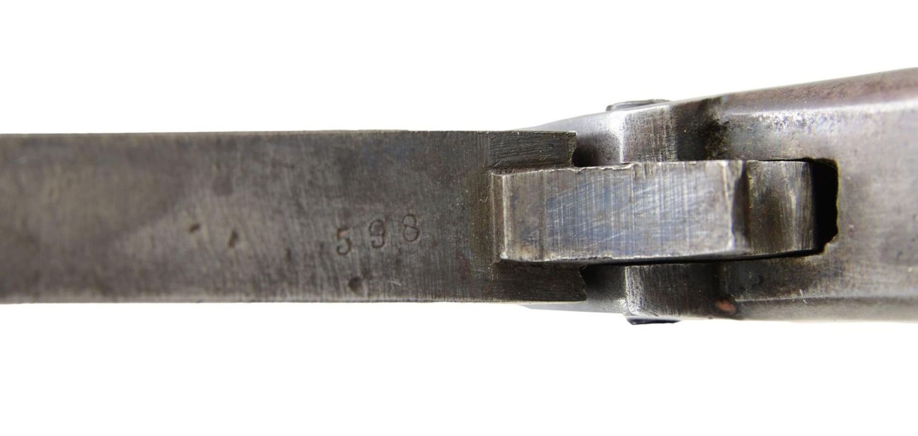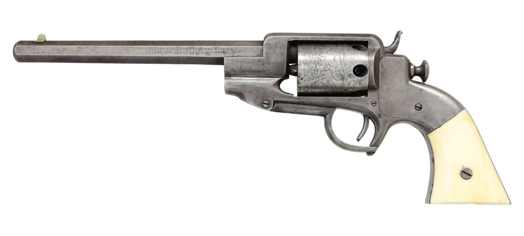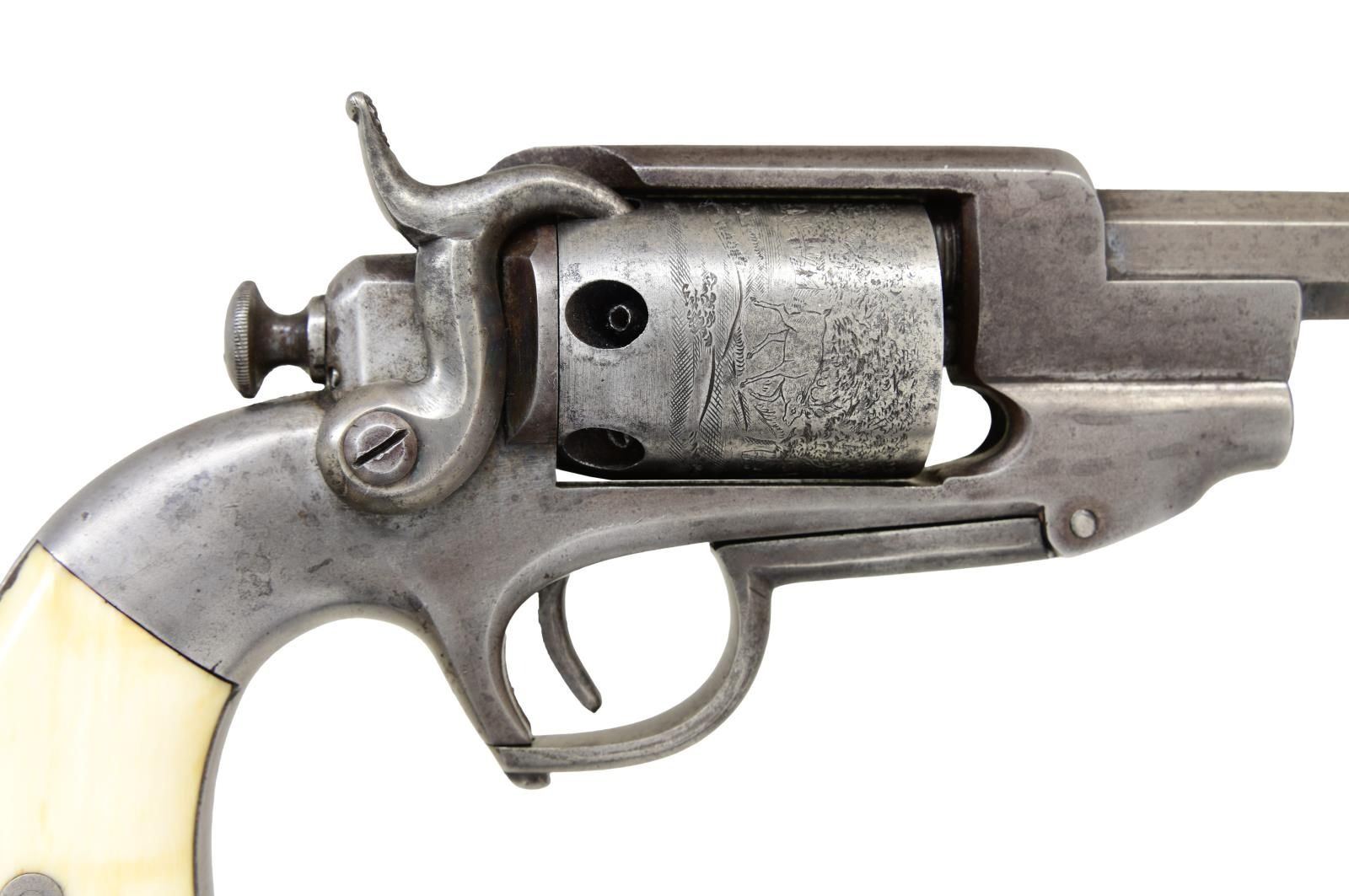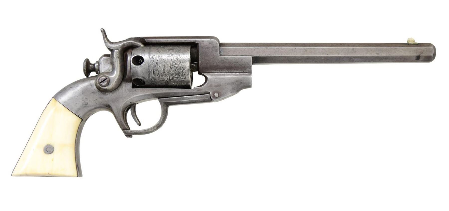 HAMMER NAVY REVOLVER, “LT. WM. H. GIBBS, 15TH ILLINOIS. Cal. .36 cal. S# 598. This large frame revolver measuring 14" overall is in standard configuration, 8" octagonal barrel, unique feature of folding trigger guard functions as loading arm, 2-line address & patents on left side of barrel. This was a rather expensive arm in its day and only about 750 were made. Mounted with fine smooth grips and inscribed in script on butt strap: “Lieut. Wm. H. Gibbs”. This is a deluxe revolver with ivory and finely crowned muzzle. William H. Gibbs (1836-1875) was seminary student at Mount Morris college, when war began & entered service at Lincoln’s first call for troops: April 22nd 1861 as 2nd lieut., Co. H, 15th Illinois, he was promoted to captain Feb 15, 1863, before mustering out July 20, 1864 during the heat of the Atlanta campaign. The 15th Illinois was one of the most heavily fought regiment at Shiloh, Corinth, and Vicksburg with numerous casualties. Gibbs moved to Mississippi just after the war, married, started a family, elected to Mississippi State Senate 1878-1870, and then appointed postmaster of Jackson. He was a good moral carpetbagger. After his death, his widow and children stayed in Jackson, and their families are prominent today in Mississippi. UNATTACHED ACCESSORIES: Small file of research. CONDITION: very good overall. appears complete, original & matching S#s including ivory grips. Metal is overall has smooth gray patina. Maker marks & S#s are clear & discernable. The rolled pastoral cylinder scene often worn is very nice & complete on this example. Grips are well fit with a mellow patina. Mechanically fine, well discerned rifled bore. PROVENANCE: Bernie Braverman, 1984; from the Lifelong Collection of Robert "Mike" Bricker.. (01-24954/JS). ANTIQUE. $3,000-4,000.