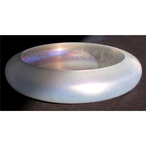 This is a stunning rare opaline stretch glass bowl with a strong iridescence, reminiscent of Steuben glass. It is fairly large, American c. 1920 made piece - 10" in diameter and 2-1/4" high, with ground pontil on the base. Comments from the glass experts will be appreciated. It is as near perfect condition as any hand made piece of glass can be.