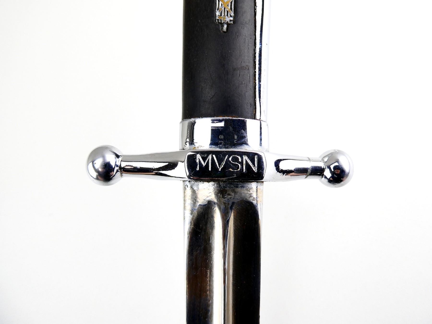 (1) CHROMED ITALIAN FASCIST DAGGER, CROSS-GUARD MARKED: "MVSN", OTHER-SIDE MARKED: "E 431", EBONY GRIP WITH EMBLEMS, CHROMED STEEL SCABBARD WITH LARGE BELT LOOP, NO VISIBLE MARKINGS, BLADE APPROX. 7.75" & OAL APPROX. 12 5/8". SEE PHOTOS.