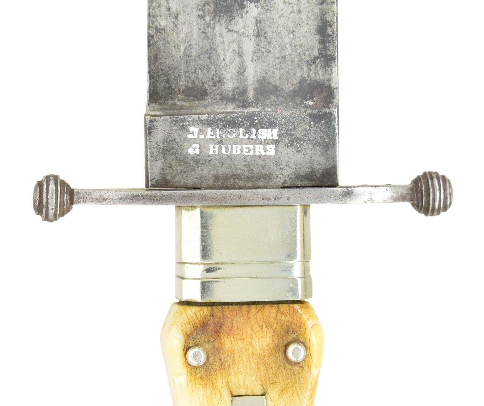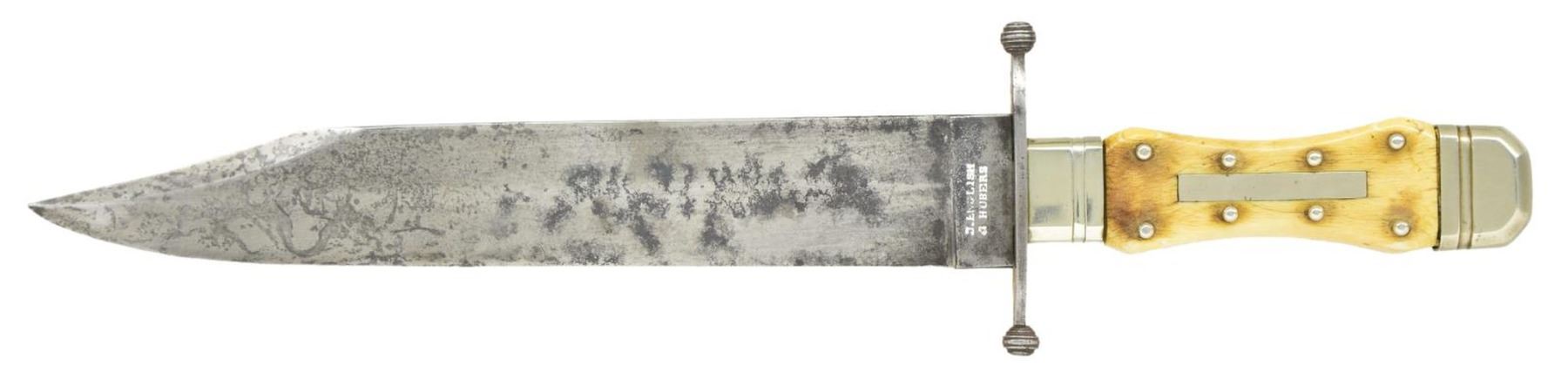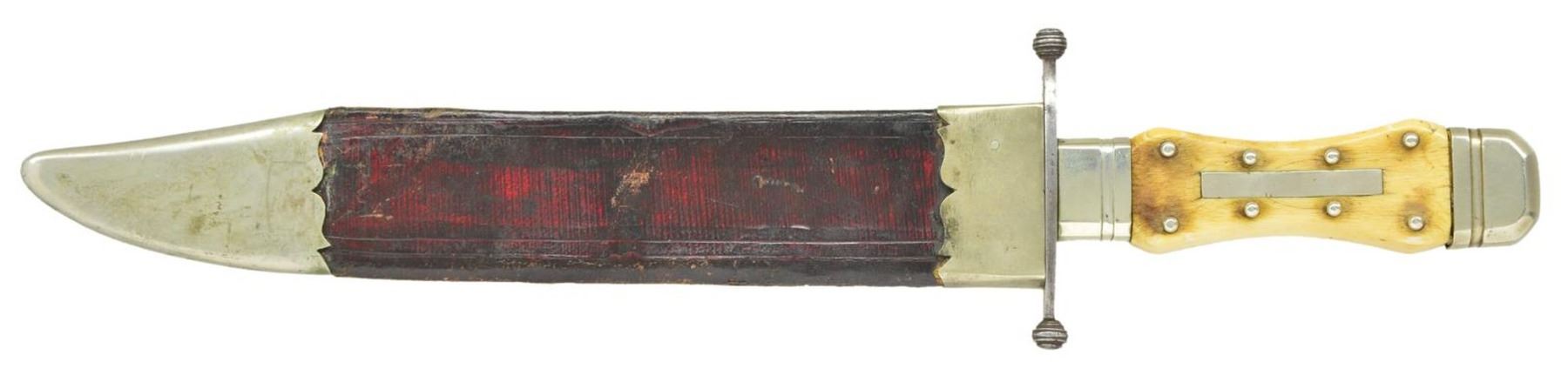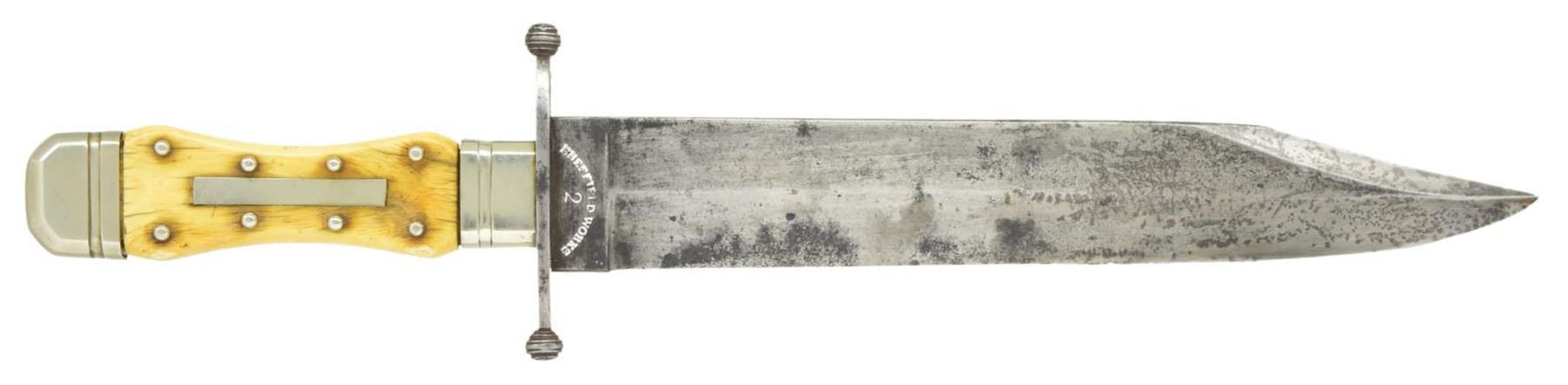 BOWIE KNIFE, EX-WILLIAMSON COLLECTION. 14.5” overall, 9.5” clip point blade stamped “J. ENGLISH / & HUBERS” on one ricasso, the other “SHEFFIELD WORKS” in an arc over “2”. The number denotes the size of this very early American Bowie knife. Sheffield was always known as the home of great cutlery, so English & Hubers named their firm Sheffield Works even though in Philadelphia. This is very scarce and popular pattern with distinctive wasp-waist silver studded ivory grip with German silver pommel & ferrule. UNATTACHED ACCESSORIES: Letter of provenance written by Mark Zalesky. CONDITION: very good overall, one escutcheon has been restored with silver instead of the original German silver. Blade has mottled iron patina with pitting and staining, grip has aged patina with light hairline cracking. Vintage German silver mounted sheath has been added since sold in Williamson auction. Sheath sound, red Moroccan veneer soiled and stained, old glued repair on edge, small iron frog button is original. PROVENANCE: Butterfield & Butterfield January 1997 auction of William R. Williamson Bowie Knife collection. From the Lifelong Collection of Glen E. Mattox. (02-18484/JS). $15,000-25,000.
