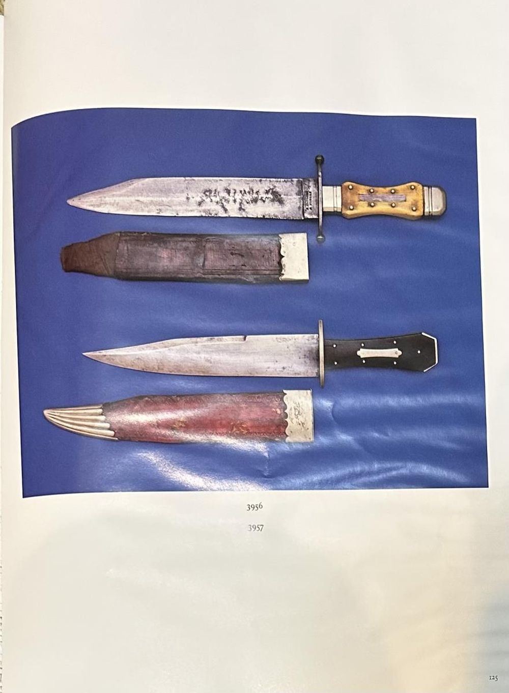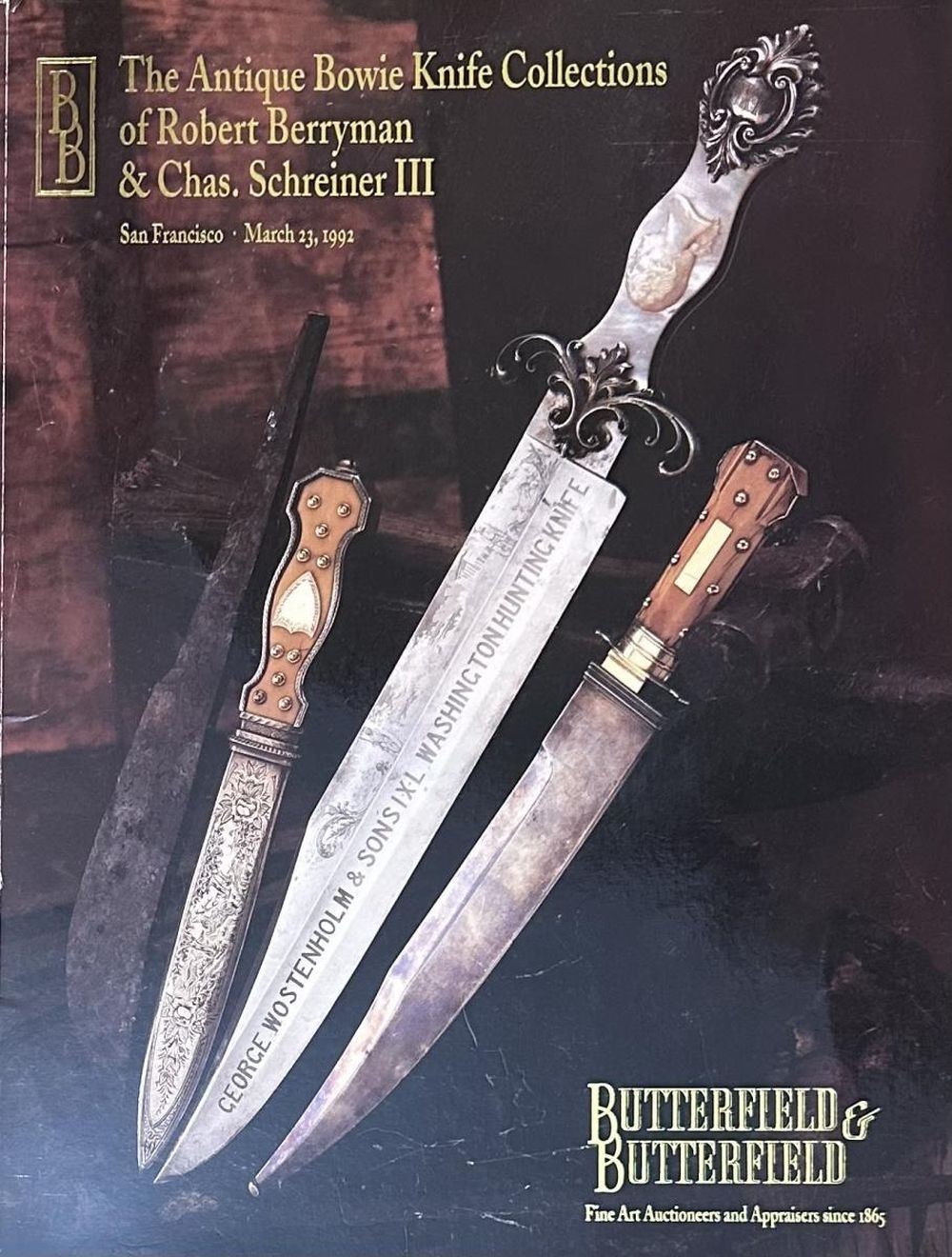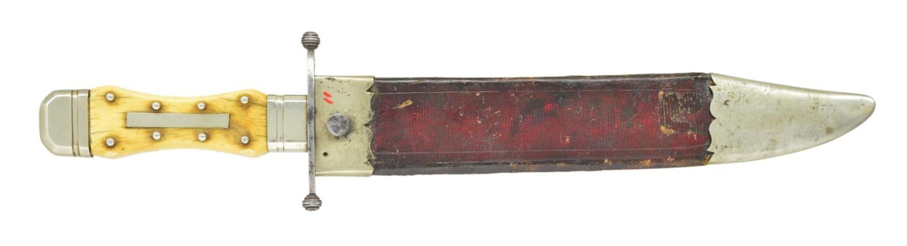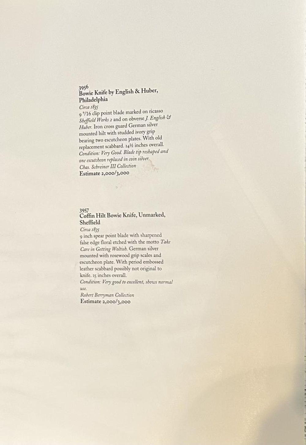 BOWIE KNIFE, EX-WILLIAMSON COLLECTION. 14.5” overall, 9.5” clip point blade stamped “J. ENGLISH / & HUBERS” on one ricasso, the other “SHEFFIELD WORKS” in an arc over “2”. The number denotes the size of this very early American Bowie knife. Sheffield was always known as the home of great cutlery, so English & Hubers named their firm Sheffield Works even though in Philadelphia. This is very scarce and popular pattern with distinctive wasp-waist silver studded ivory grip with German silver pommel & ferrule. UNATTACHED ACCESSORIES: Letter of provenance written by Mark Zalesky. CONDITION: very good overall, one escutcheon has been restored with silver instead of the original German silver. Blade has mottled iron patina with pitting and staining, grip has aged patina with light hairline cracking. Vintage German silver mounted sheath has been added since sold in Williamson auction. Sheath sound, red Moroccan veneer soiled and stained, old glued repair on edge, small iron frog button is original. PROVENANCE: Butterfield & Butterfield January 1997 auction of William R. Williamson Bowie Knife collection. From the Lifelong Collection of Glen E. Mattox. (02-18484/JS). $15,000-25,000.