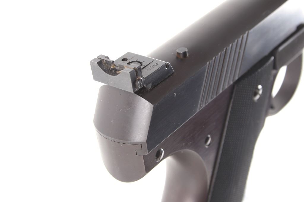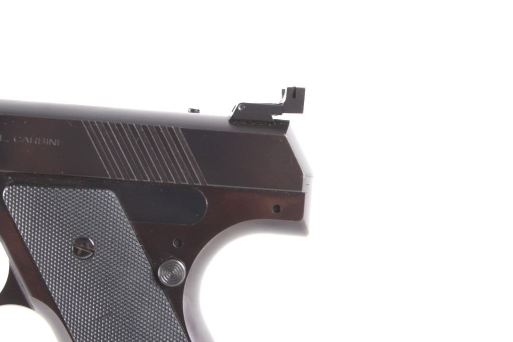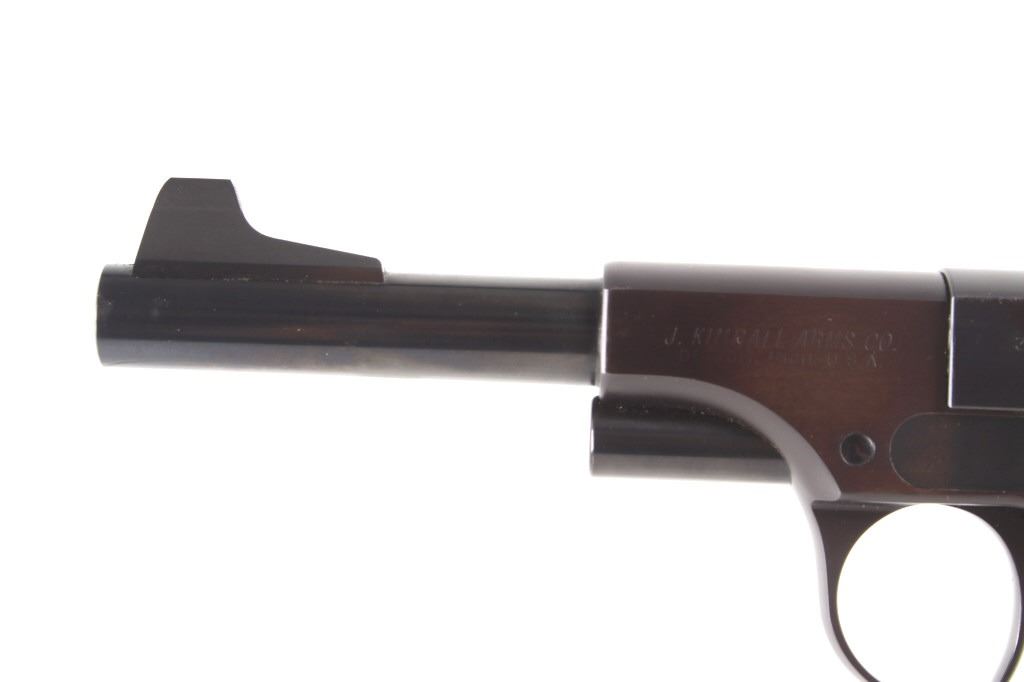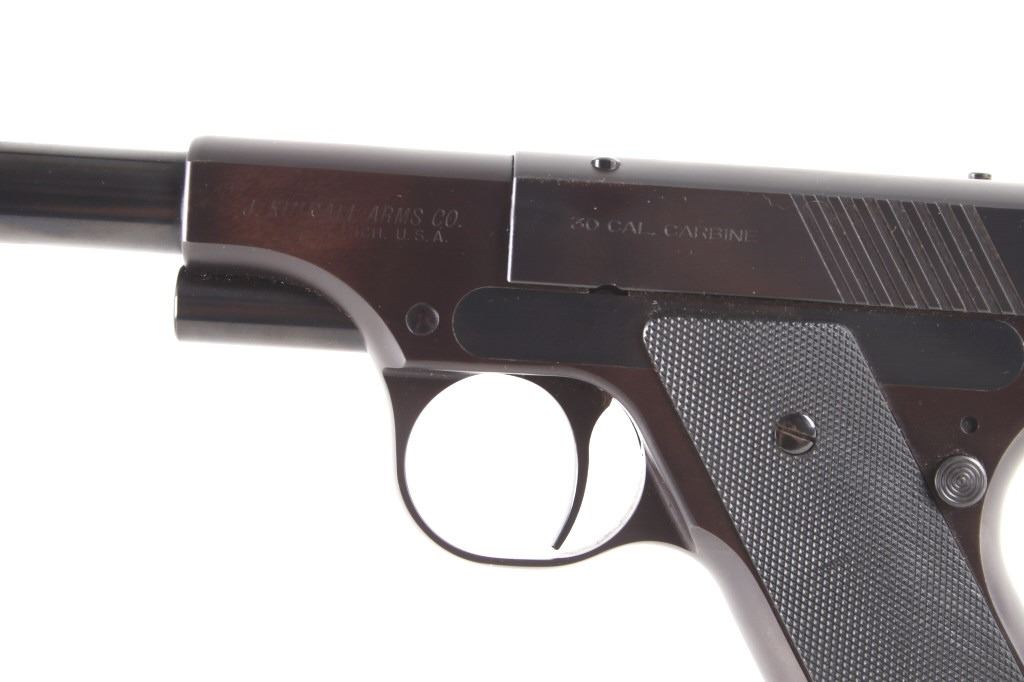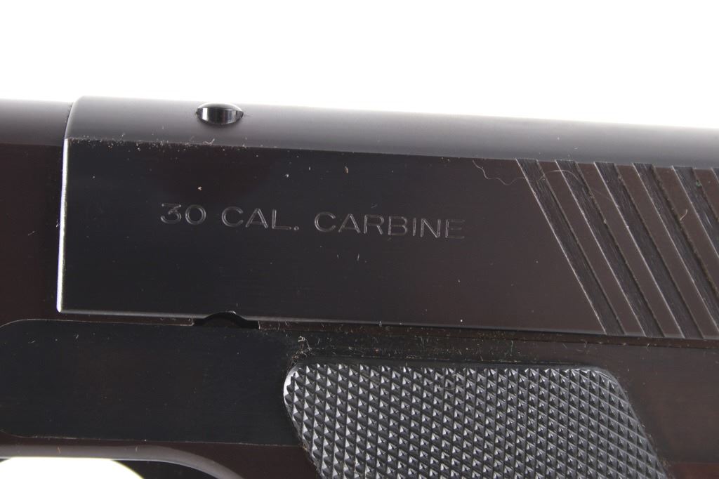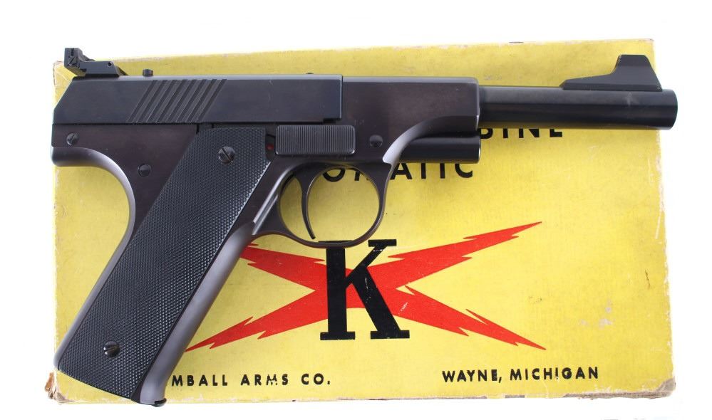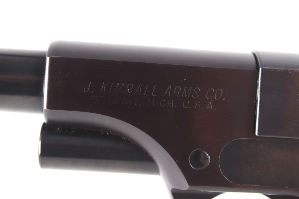 DETROIT, MICH. U.S.A. and 30 CAL. CARBINE. For advanced collectors the Kimball auto pistol in this unusual .30 Carbine caliber is one of the most elusive American handguns ever produced and examples rarely come up for sale. Even the most advanced auto pistol or general handgun collections probably lack one of these. Of those that still exist, this may be the best as it retains the original factory box and manual. This is about as truly rare as an American produced handgun can be. The pistol weighs 2lbs 8oz. Serial Number: 12. This is a modern firearm and requires a FFL transfer or NICS background check.