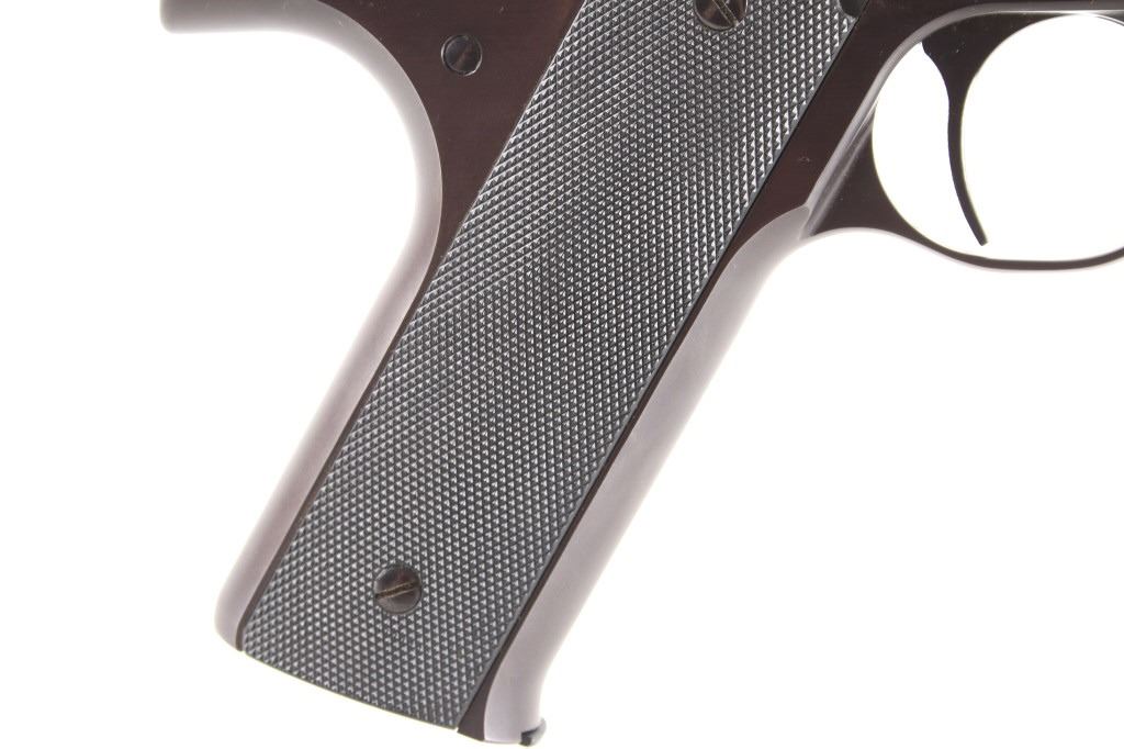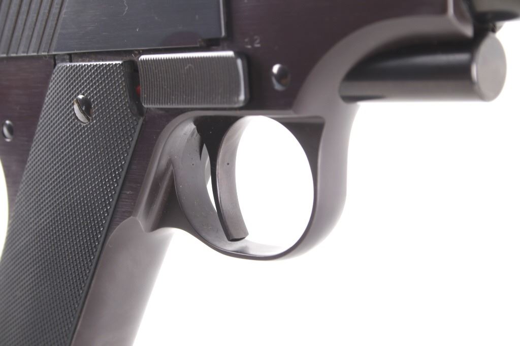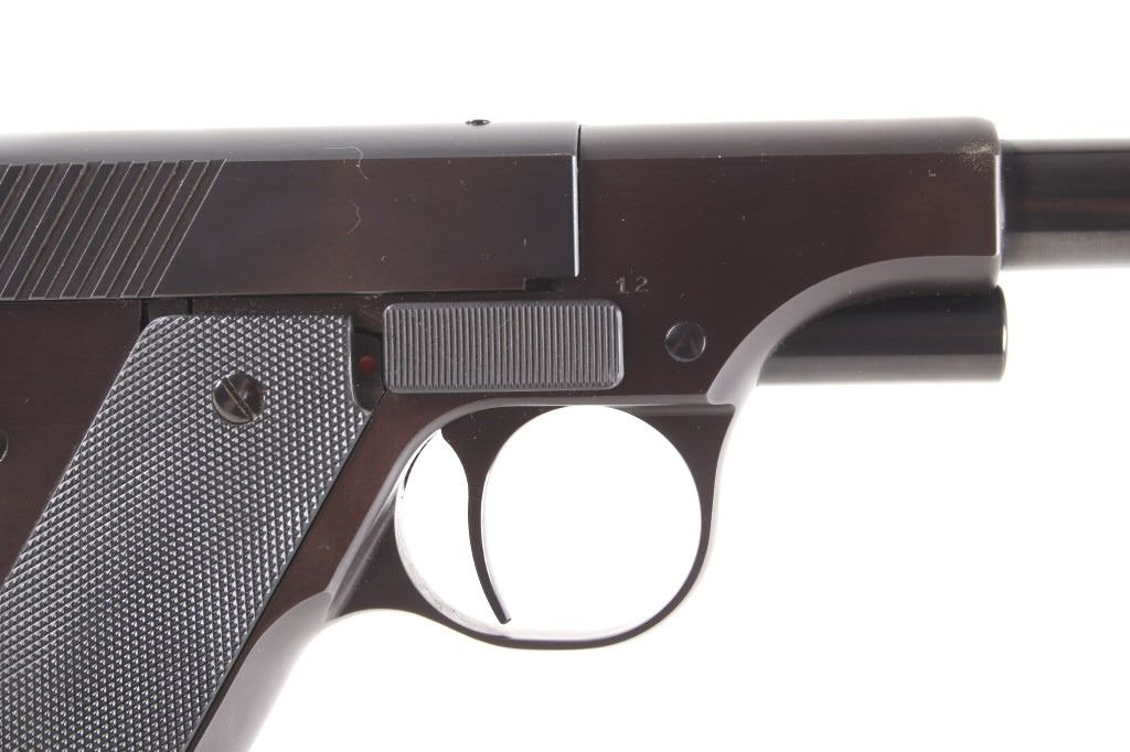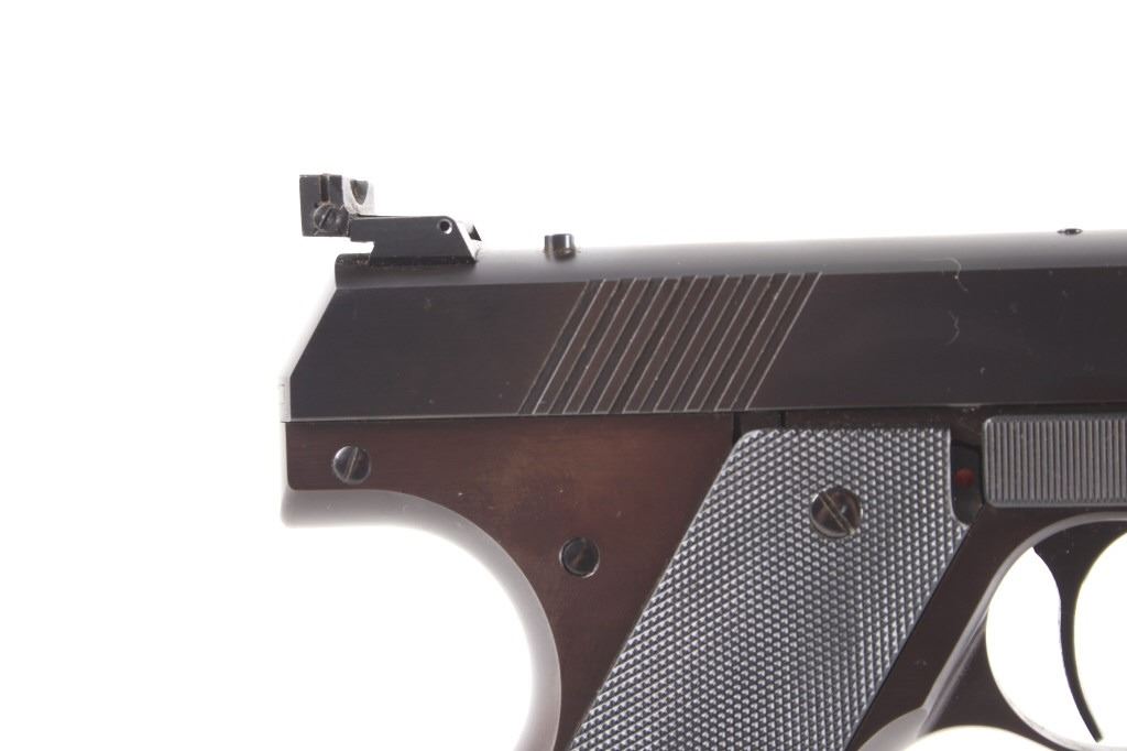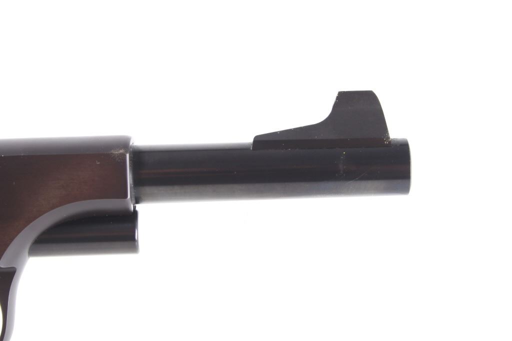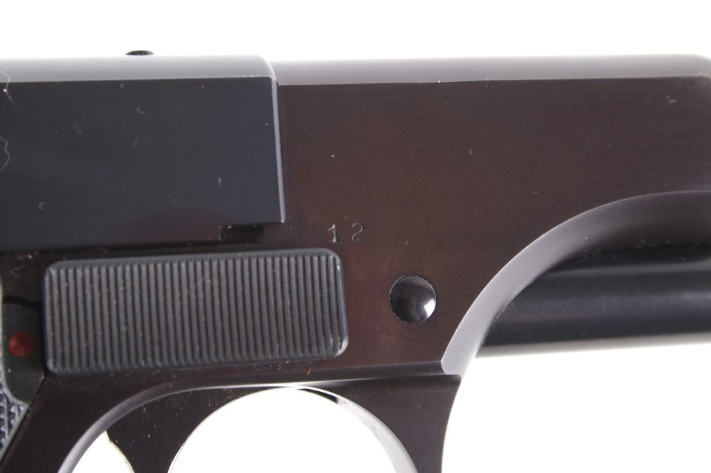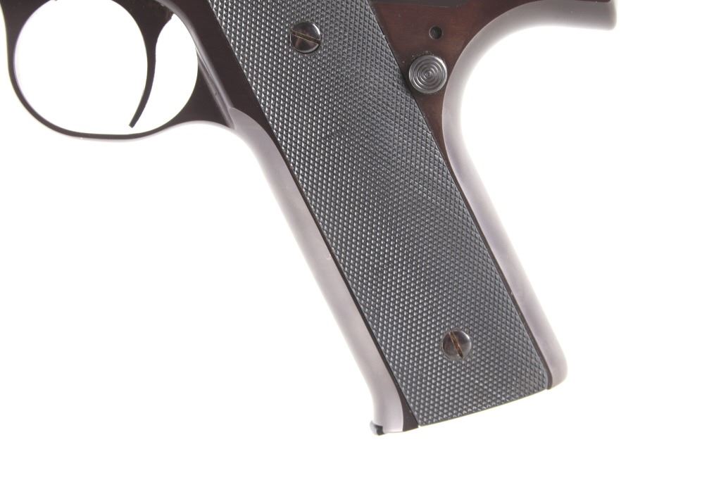 DETROIT, MICH. U.S.A. and 30 CAL. CARBINE. For advanced collectors the Kimball auto pistol in this unusual .30 Carbine caliber is one of the most elusive American handguns ever produced and examples rarely come up for sale. Even the most advanced auto pistol or general handgun collections probably lack one of these. Of those that still exist, this may be the best as it retains the original factory box and manual. This is about as truly rare as an American produced handgun can be. The pistol weighs 2lbs 8oz. Serial Number: 12. This is a modern firearm and requires a FFL transfer or NICS background check.
