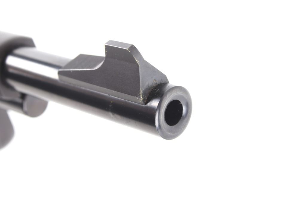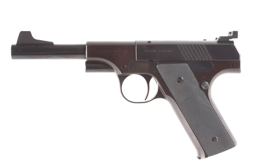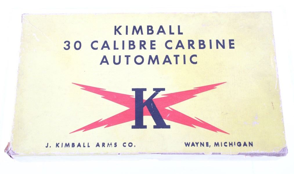 One of the most rare and unusual American made auto pistols is this J. Kimball Arms Co. .30 carbine caliber auto pistol. Only 250-300 were made in 1955. This Detroit, Michigan company attempted to produce a pistol for the popular .30 M1 Carbine round. During this time surplus ammo was cheap and readily available. However, there were problems with the basic design of this pistol and the company went out of business soon after production began. This example with 5" barrel, adjustable target rear sight and serial number 12 IS BRAND NEW IN THE ORIGINAL BOX WITH OWNERS MANUAL! The box is in excellent condition with only some normal scuffs and handling. All end and top markings are sharp and clear. The owners manual is also fine. The pistol is marked KIMBALL ARMS CO.