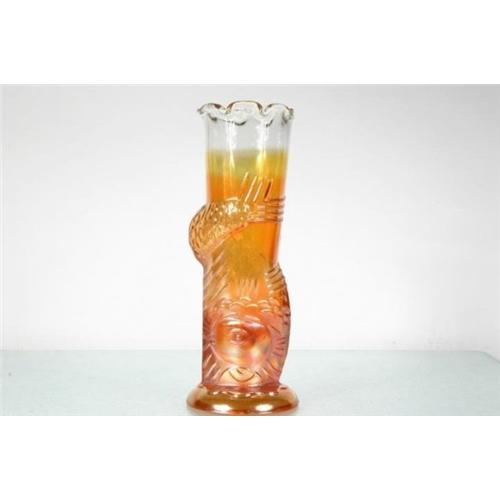 Superb example of Rare Indian Carnival Glass by Jain in serpent vase design as wonderfully stylized. Nice deep marigold irridescent color. Its a hard to find carnival vase in very good condition except for a small chip to the bottom base, roughness to rim. Price reflected the imperfection.