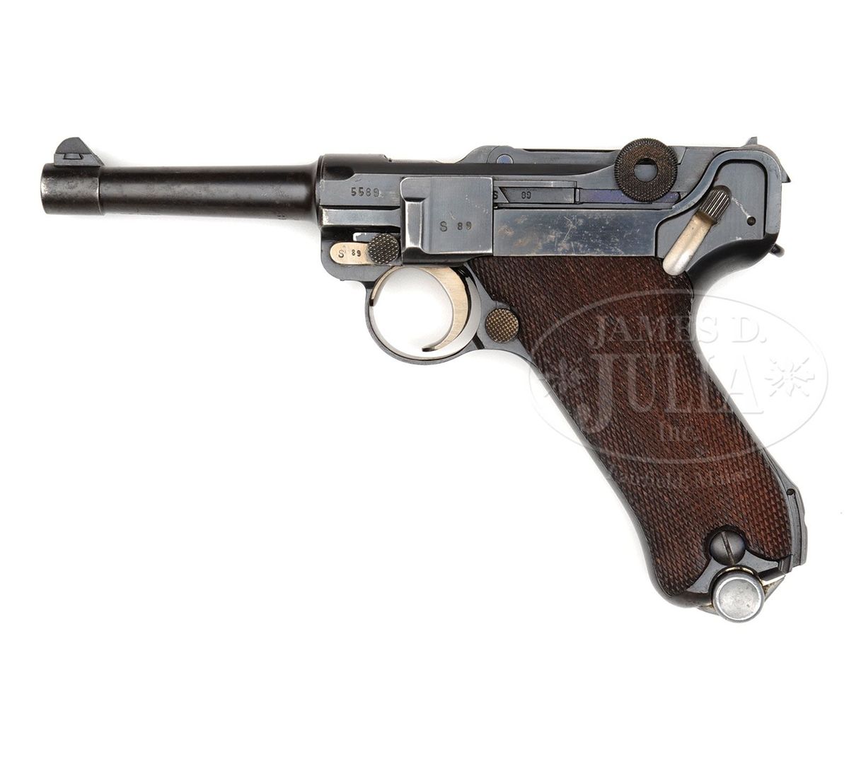 SN 5589. 4" 9mm bbl. "K" (1934 code) above chamber. Roman "S/42" (Mauser code) on center toggle link as shown on p. 738 of Dr. Geoffrey Sturgess' The Borchardt & Luger Automatic Pistols. Fraktur "S" on all parts. This gun is shown on several pages within the book. B/90 S/91 receiver proofs as shown on p. 469. The left side is shown on page 1119 and the stock lug is shown on page 1110. All numbers on the gun are matching. Checkered walnut grips are unnumbered and unmarked. Proper B/90 proofed aluminum bottom magazine does not match. PROVENANCE: Collection of Dr. Geoffrey Sturgess. CONDITION: Fine. Retains 90% original blue with scattered light pitting on the left side. Gripstraps and bbl are starting to brown. Some straw has been reheated to about 85% overall. Grips have light wear. Magazine is excellent. Mechanics are sound. 4-52955 BWS5