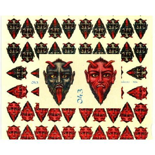 Rare CHRISTMAS paper collectible - large uncut scrap sheet of Red and Grey Devil. There are 92 images on this large 15-3/4" x 10-1/4" sheet, each 1-1/2" high. Marked VB, number 043, dated (4th edition) 1934. St. Nicholas Day (December 6th) was very popular Holiday in Europe. On this day small children were visited by trio of St. Nicholas, Devil and Angel. The Devil reminded them that they should listen their parents and behave well -otherwise he would take them with him. The Saint Nicholas would then reward the children usually with gingerbread cookies with the St. Nicholas, Devil or Angel scraps pasted on them. This vintage chromolithograph coated with gummastic based laquer survived its 70+ years of age in near MINT condition. Comparable, more common scraps list at $1-2 each. "Devils head" in this condition is very hard to find, full sheet is a RARITY!!! Please note that we are picturing only part of the sheet, because it is to large to fit in the scanner.