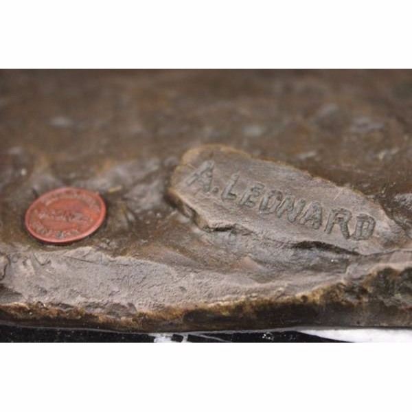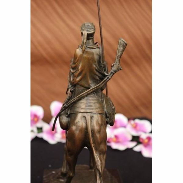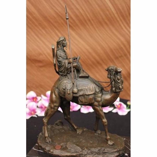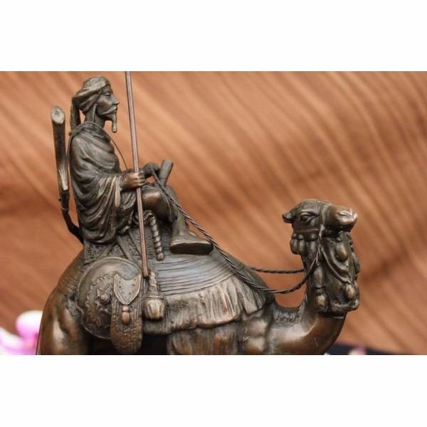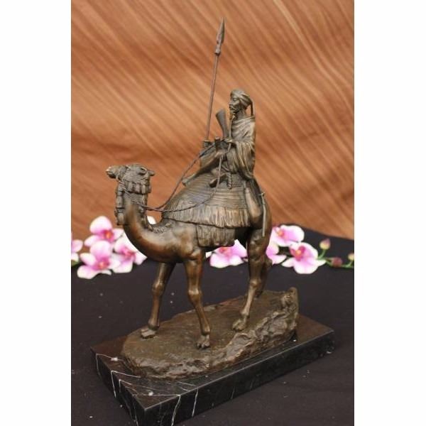 This Arab man travels to the hot desert with his camel and in his little chair he sits with a spear on his right hand. The most important of all the animals to the medieval Muslims was the camel. Camels were called "the Gift of God" and "the Ships of the Desert". It could live where few other animals could live. It was strong enough to carry heavy loads for the Arab caravan traders. At the time of the Prophet Muhammad, the camel was the most important animal in war. The earliest wars were attacks with warriors mounted on camels' backs.When we begin reasoning about the symbolic meaning of camels, we cannot miss the prevalent symbolic themes of journeying. The essence of long-distance travel is at the symbolic heart of the camel, and it's easy to see why. It's no secret the camel can endure days in scorching hot deserts while transporting precious cargo across great distances. This bronze sculpture was casted using the "Lost Wax Method" and has a brown Patina and it has the European Bronze Finery stamp of quality and is signed A. Leonard. Condition: Both sculpture are in perfect condition. Bronze Dimensions with Marble Base each :Height 15 1/2" x Width 12" each Marble size: 10" X 6" Height without base:14 1/2" Each statue Weight : 17 LBS Inventory : 24B7877142