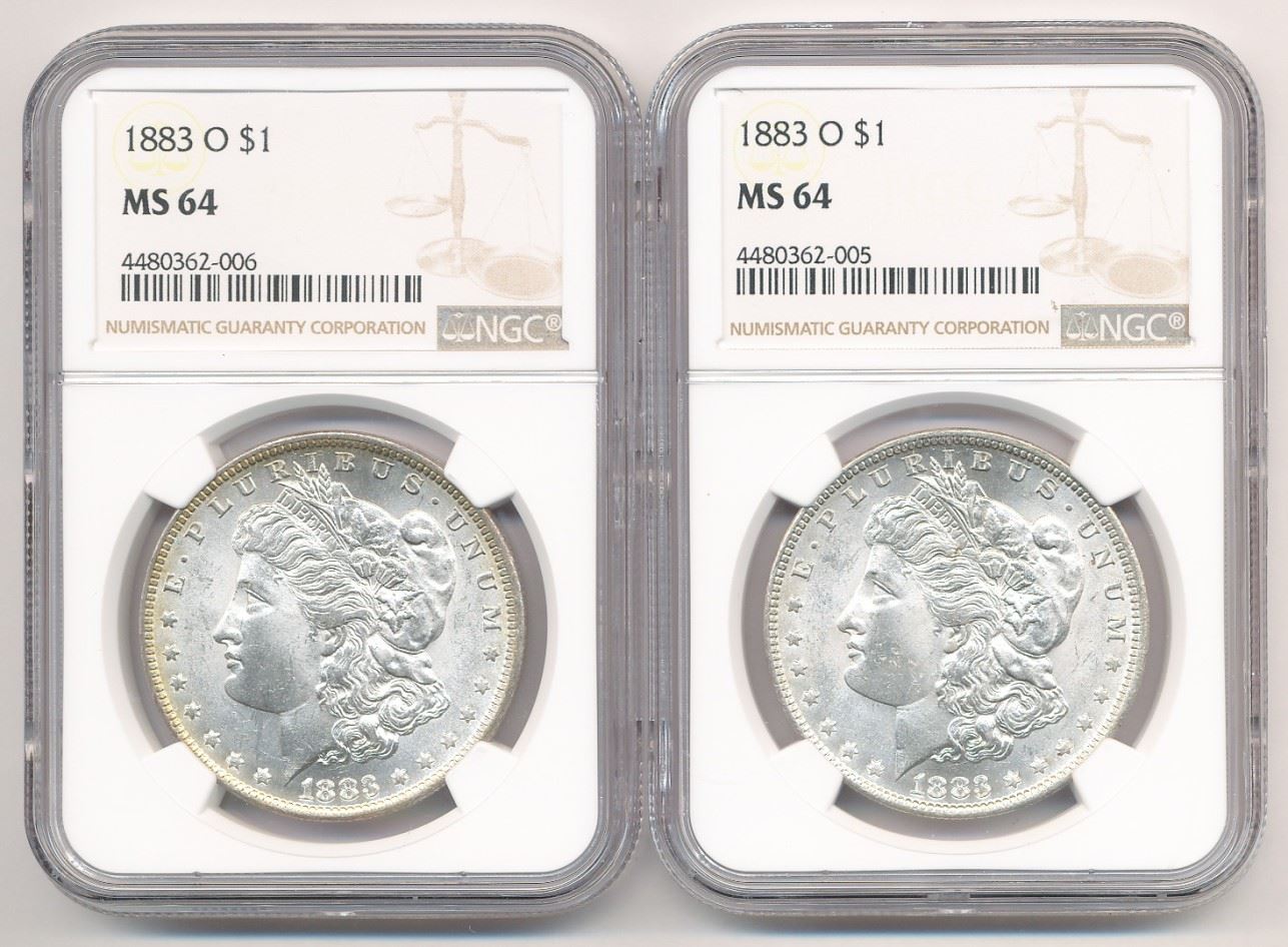 THIS TINY DIE LINE HAPPENED AT THE NEW ORLEANS MINT. EXTREMELY RARE TO FIND 2 CONSECUTIVELY GRADED FROM THE SAME DIE THAT MEANS THESE HAD TO BE MINTED VERY CLOSE TO SAME TIME!! BACK IN 1883.LOT OF (2) WITH DIE BREAK 1883-O $1 MORGAN SILVER DOLLAR NGC MS 64 ML1