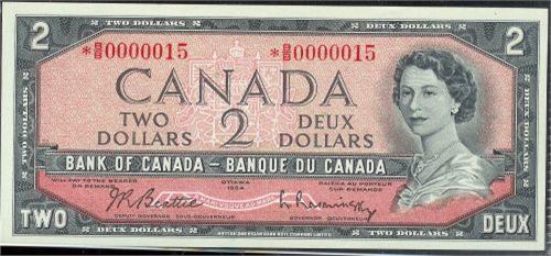 RARE LOW SERIAL NUMBERED REPLACEMENT NOTE *B/B0000015 $2 1954 BC-38b Beattie-Rasminski, Gem uncirculated! Lowest recorded number seen! Worth a premium bid! Rare.