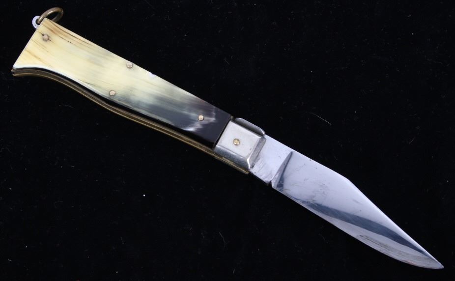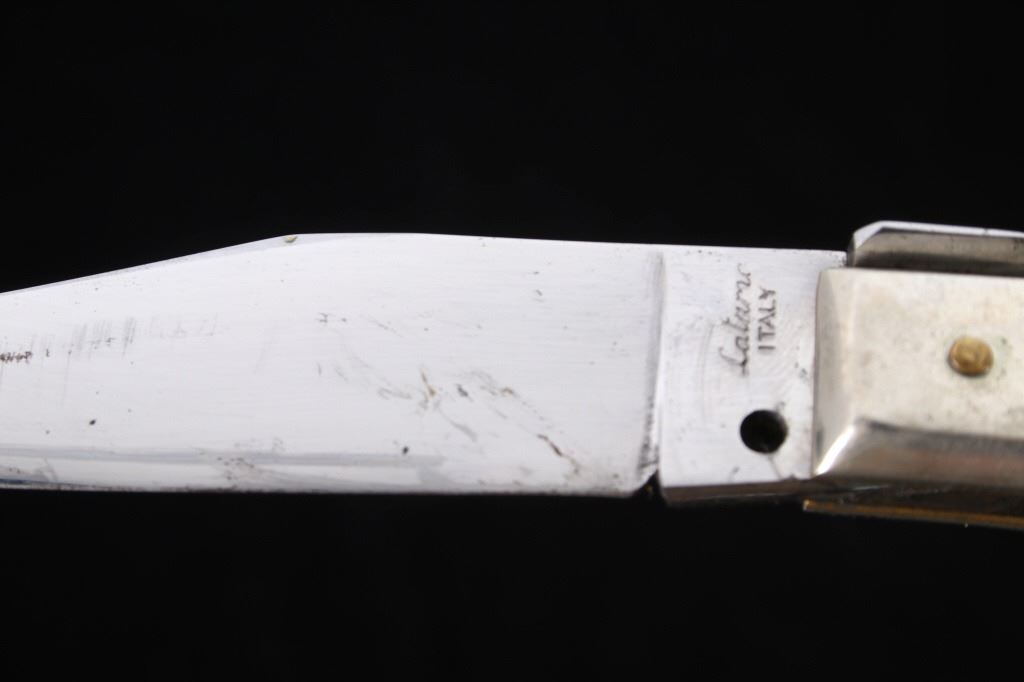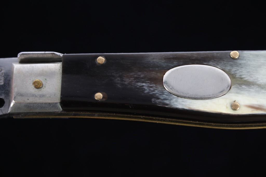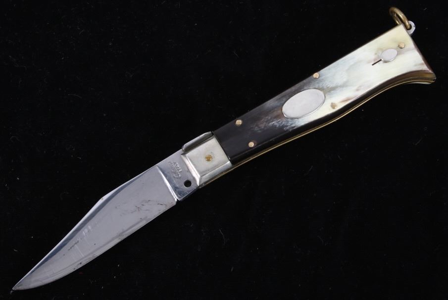 Featured in this lot is this rare Latama Cutlery Italian clip point switchblade made in Maniago, Italy. The Latama Walts Classic switchblade is considered the “Cadillac” of switchblades due to its incredible design, historic reliability and extremely high quality 5MM backspring. This example has handmade by the Latama artisans in Italy using 440C stainless steel with nickel silver bolsters and pommel, brass bolster linings and pins and features composite grips with a locking mechanism to lock the spring. The blade shows a sharpened clip point design and is marked 'Latama' and 'Italy' on the base of the blade. Each of these Latama knives are handmade with no two being the exact same and very few produced due to the nature of their detailed craft. The condition of this switchblade is good with no obvious signs of damage and shows good overall condition. The measurements of this switchblade folded up is 4 3/4"1 1/8" x 3/4" and unfolded it measures 8 1/8" x 1 1/8" x 3/4" and shows a blade length of 3 1/2".