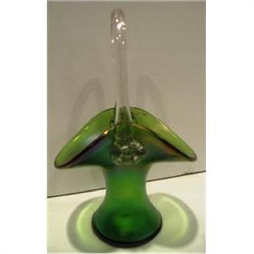 This Fantastic Hand Blown Green Loetz Basket has an applied crystal handle and is in SUPERIOR condition with no chips, cracks, or dings and it measures 4.50" long and is 3" wide and stands 7" tall to the top of its handle. This basket is marked on the bottom with the familiar script Loetz and Austria Logo.