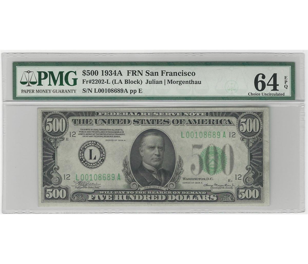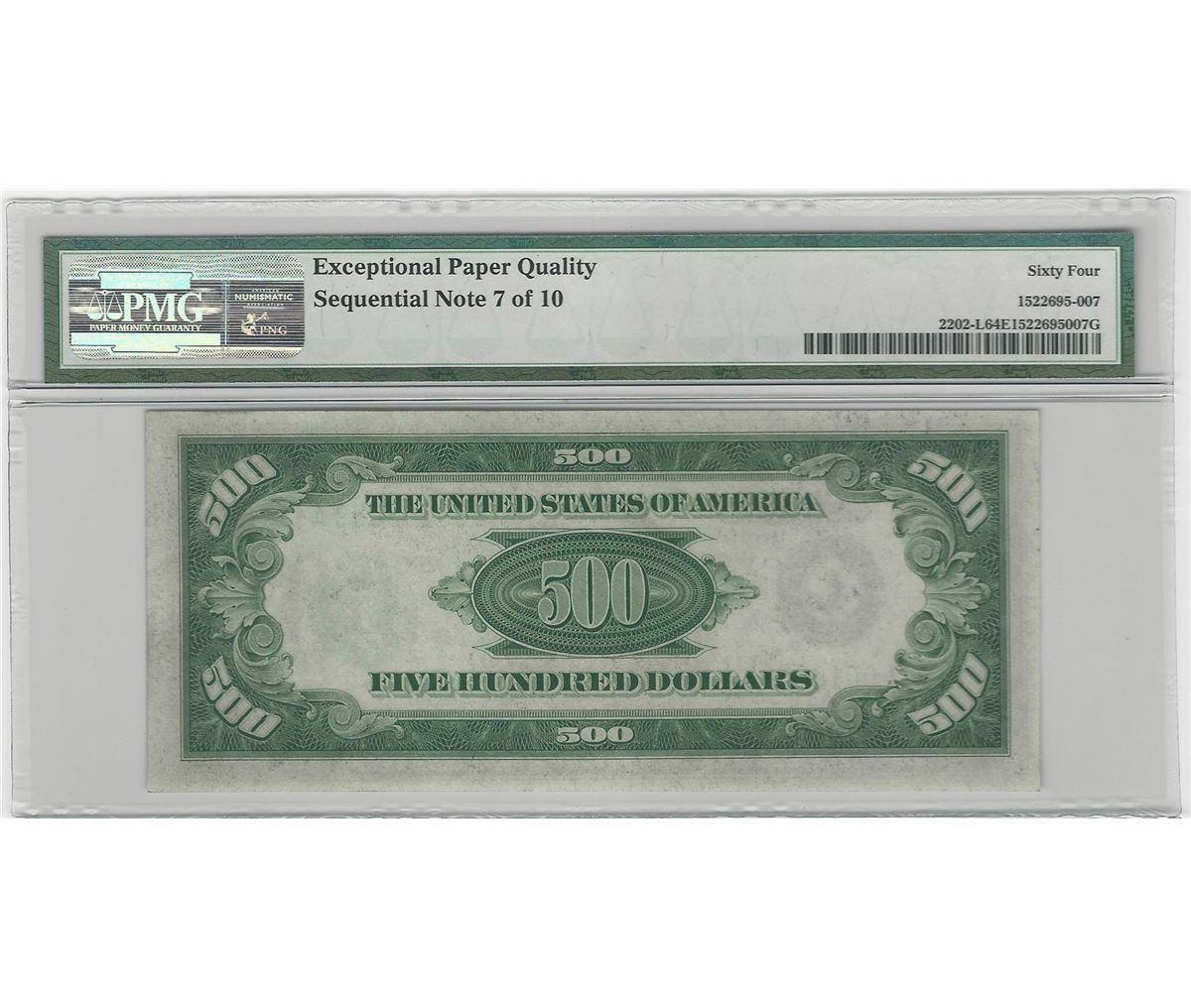 This lot of (3) 1934A $500 FRN Notes would be collectible by itself, however once you add in the fact that these notes are 3 consecutive serial #'s, and that they are excellent quality notes being graded PMG Choice Uncirculated 64EPQ, this set becomes ver PMG Certified.