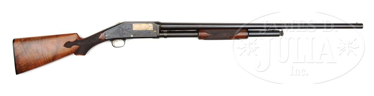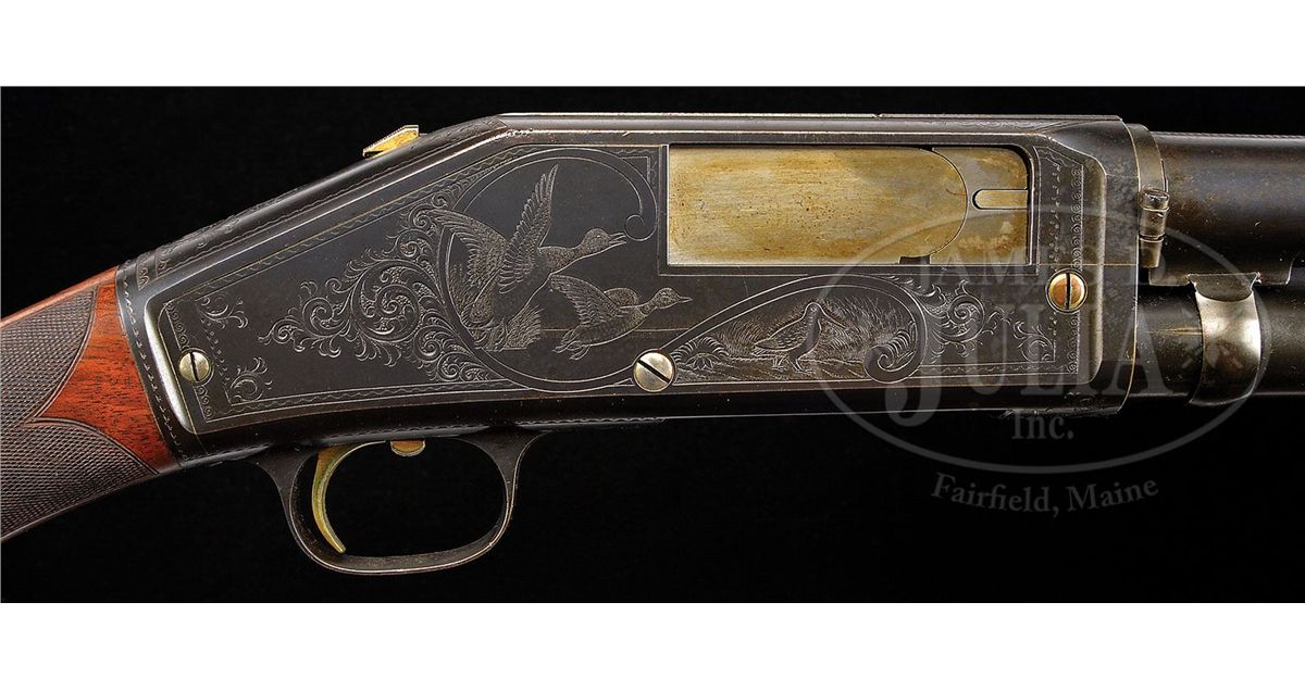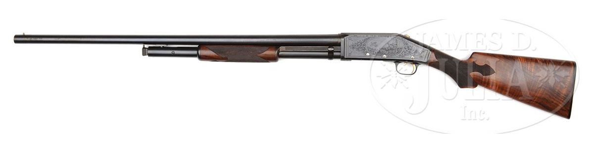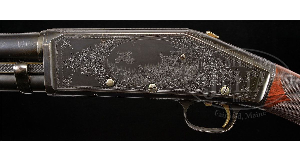 SN 1249. Cal. 16 ga. Spectacular pump shotgun made in very limited numbers between 1914-1917 with only about 4,282 produced in that time frame in both 20 & 16 ga. and in two bbl lengths. This shotgun has 28" matted top bbl with raised matted top receiver, sgl silver bead and 5-rd magazine under the bbl. Mounted with very highly figured circassian walnut with 32-line per inch checkered rnd forearm and serpentine grip buttstock that has serrated hard rubber buttplate. Outside face of the action rod is matted just like top of the bbl. Receiver is beautifully engraved by Alden George Ulrich (1888-1949)with the very large vignette of three Ruffed Grouse in a very detailed woodland scene on left side and the beautiful vignettes of two flying mallards in a marsh scene and a walking woodcock on the right side. Both sides have very nicely detailed & shaded foliate arabesque patterns with pearled background. Matching engraving extends over top & bottom of receiver. Slide release, screws, safety & trigger are gold washed. This is one of Marlin's finest shotguns and their highest grade shotgun that cost double the next highest grade at $141.90 in 1917, at which time Marlin stopped production of their shotguns. CONDITION: Extremely fine. Overall retains just about all of its strong blue finish with some light chemical spotting on top of receiver and some light discoloration on the bbl; trigger, screws & other small parts retain most of their light gold wash. Wood is sound with only one or two tiny nicks and retains about all of its crisp, orig oil finish; checkering shows light diamond point wear. Mechanics are crisp, brilliant shiny bore, appears to be new & unfired. 4-49506 JR400