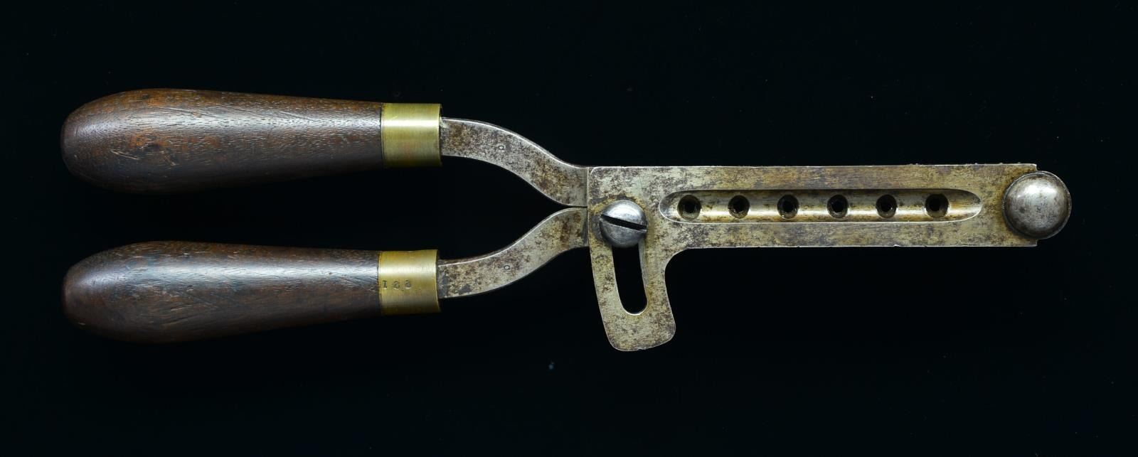 BULLET MOLD. Gang molds like this example are difficult to find in good condition because of heavy use during the Civil War, but this example likely ranks among the finest known specimens. A 12 3/4"squad-size gang bullet mold w/ six 44 caliber cavities w/ lubricating groove & rebated base. It has attached sprue cutter w/ turned walnut handles & brass ferrules. The right brass ferrule is stamped, “221”. Metal handles are each stamped w/ a “C” inspector mark on top & a “D” on the bottom of the left handle. Right front is marked “44H”. It is believed that this mold is for the 44 caliber Army revolver or possibly the 44 caliber Model 1855 revolving rifle as it has a pointed bullet rather than the flat-nose bullet required for the Henry or Winchester rifles. CONDITION: mold has obviously been used & only traces of fire blue remain. The mold still operates freely & has sharp defined details to the bullet cavities. Handles have a couple of scattered dents & dings. (02-14651/BF). $500-800.
