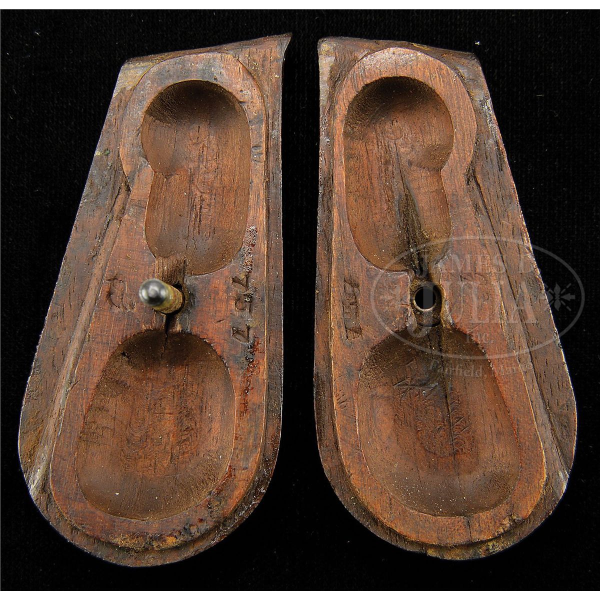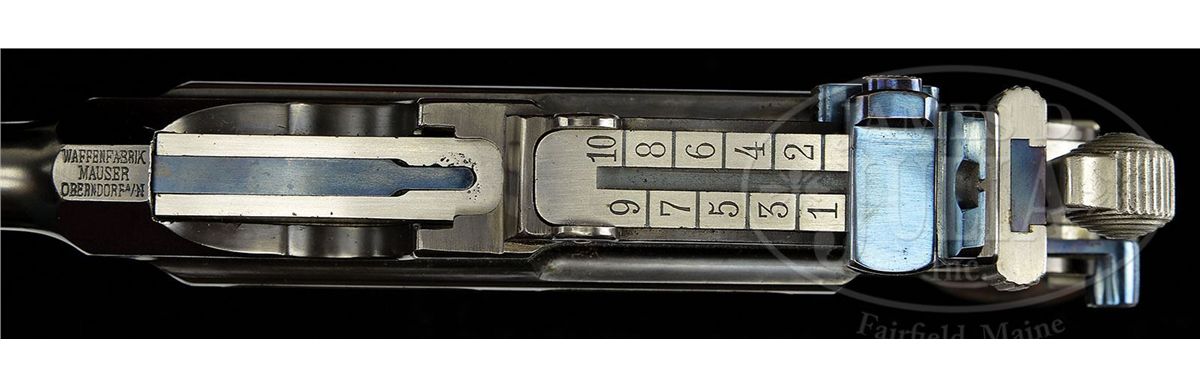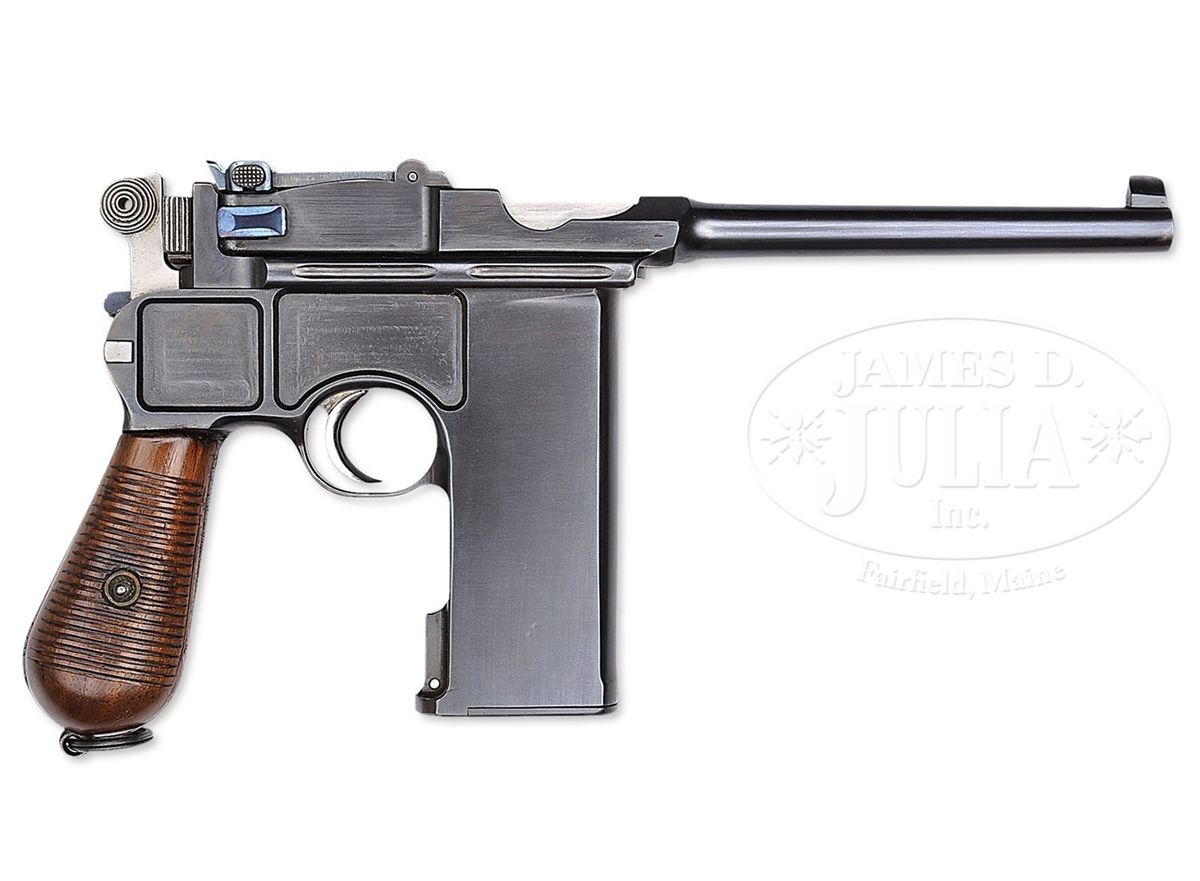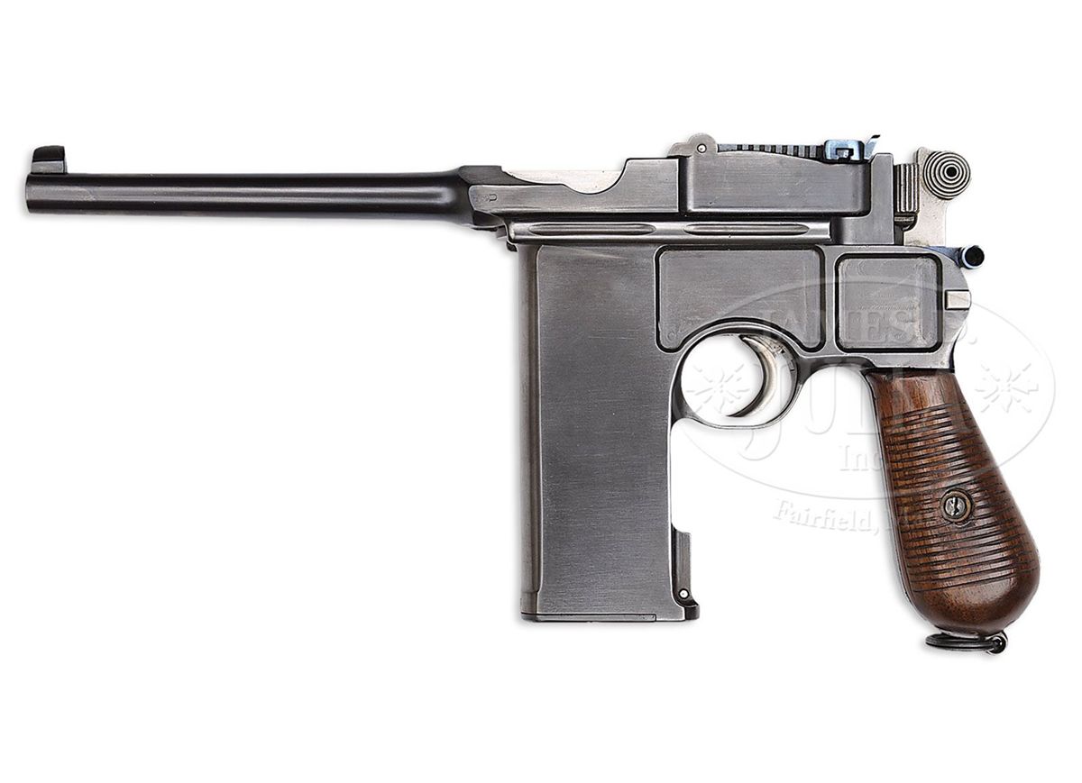 SN 757. Caliber 7.63mm. Mauser only made a handful of twenty shot C96s in this serial range. All had a 5.5" bbl and a pinned 1-10 rear sight. Usual chamber markings. A Crown U on the left side of the bbl extension and an antler proof on the right side. There are no markings on either side of the frame that did not yet include a raised island in the rearmost panel on the left side. As true for most Conehammers, this gun has a long extractor and a separately retained firing pin. Serrated walnut grips and original lanyard ring. Detailed disassembly shows all matching parts except for the firing pin that is a blank replacement. The grips have the desirable "peanut style" recesses as often found in pistols in this serial range. PROVENANCE: Joseph J. Schroeder, Jr. Collection. CONDITION: Professional restoration with over 99% bright blue. Crisp chamber marking with thinning of the Crown U marking and antler proof. Hammer and subframe have been cleaned and original grips have been sanded and revarnished. Dull bore with shallow rifling amidst considerable corrosion. Perfect mechanics. Although refinished, this is an extremely difficult to find 20-shot whose rarity and charisma should outweigh other considerations. A real asset for any collector. 4-48549 LMA29
