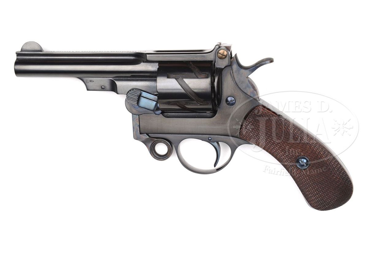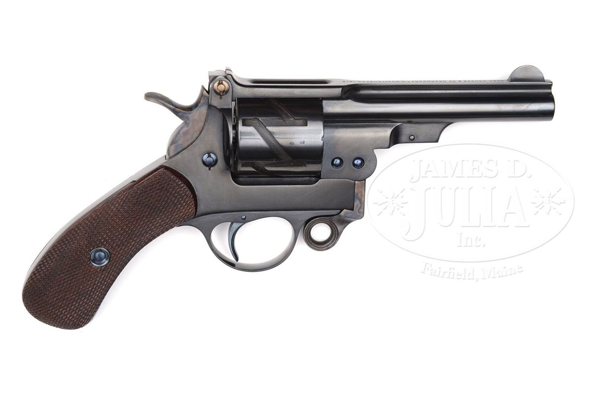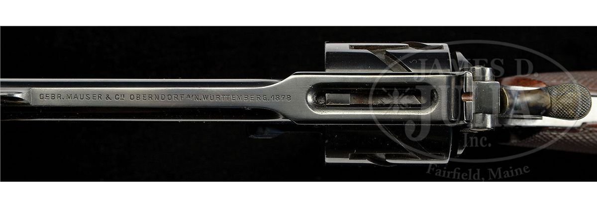 SN 190. Cal. 7.6mm Mauser rimmed. Blue finish with 3-5/8" ribbed bbl, integral front sight marked on the top rib "GEBR. MAUSER & CIE OBENDORF A/N. WURTTEMBERG. 1878". Top strap has open slot. Cyl has the unusual feature of the "Zig-Zag" pattern around the outside diameter which acts with the hand to rotate the cyl for the next shot. Left front side of the frame has a thumb safety which locks the cyl by means of a notch in the protruding rim. Bottom front of the frame has a lever which is attached to the bbl, which when opened allows the bbl to tip up for reloading. It is mounted with 2-pc full checkered, sharply angled walnut grips that appear to be modern replacements. Production numbers of the zig-zag pistol are unknown but they are believed to be extremely limited and had very limited distribution in the U.S. PROVENANCE: Joseph J. Schroeder, Jr. Collection. CONDITION: Very fine, all matching. Overall retains all of a fine professionally restored blue finish with bright case colors on the locking lever and hammer. Grips are extremely fine. Mechanics are fine. Strong bore with moderate to heavy pitting. 4-48590 JR109