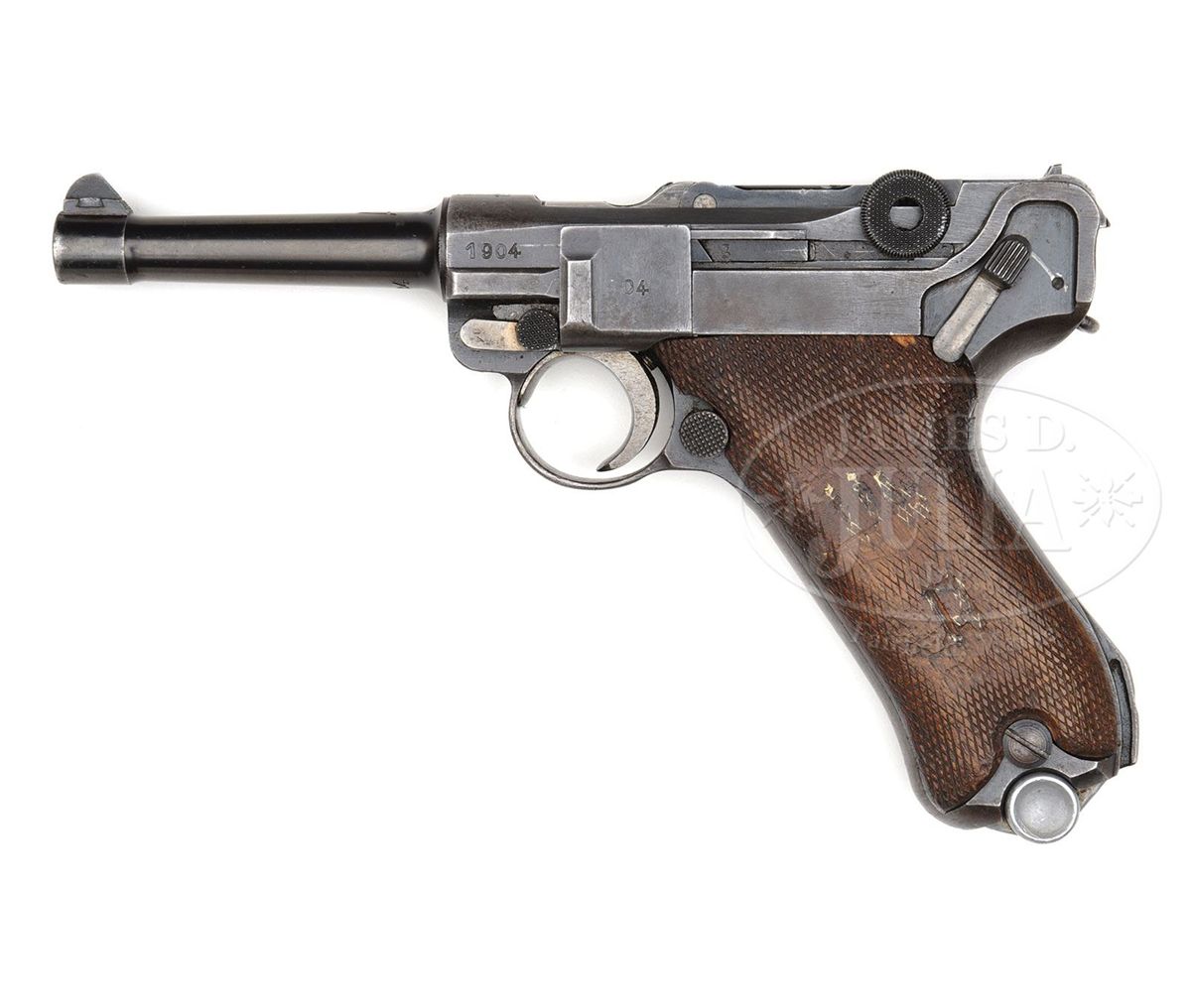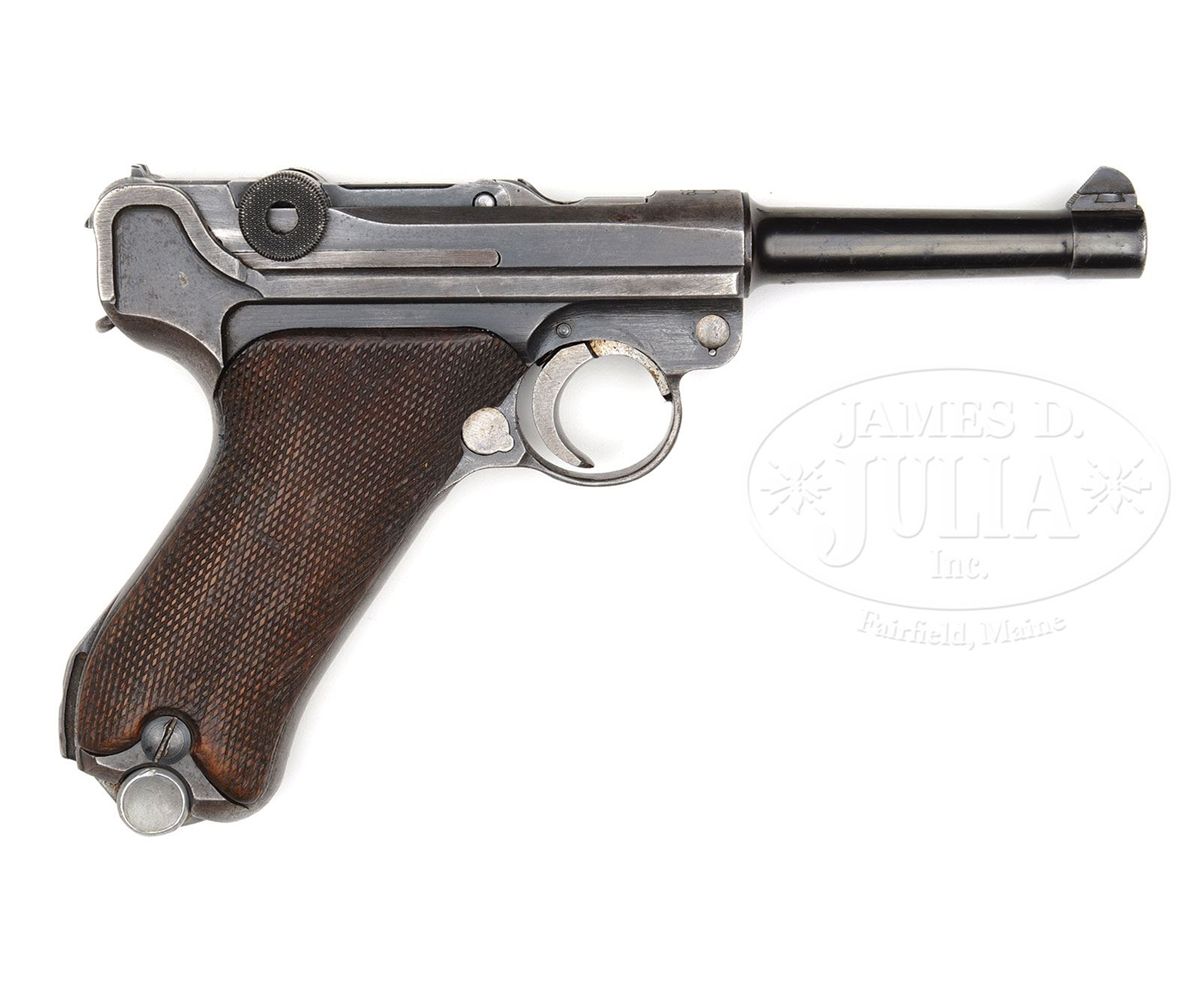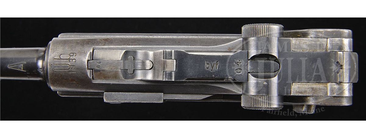 SN 1904. 4" 9mm bbl stamped "A" (“Ausschuss” - scrap or reject) "Ub" (Ubungswaffe, German for training/practice weapon) over "1939" above chamber. Marked "byf" (Mauser code) on center toggle link. Numbered parts on the gun have matching numbers except for the front toggle link which is internally mismatched. "A" and "Ub" marking appear on the left walnut grip. Magazine is Eagle/63 proofed military and is not matching. This gun is featured on p. 453 of Dr. Geoffrey Sturgess' The Borchardt & Luger Automatic Pistols. PROVENANCE: Collection of Dr. Geoffrey Sturgess. CONDITION: Good retaining 60% original blue with scattered light corrosion. Retains 40% original straw. Bore is sharp with frosting. Grips are well worn with a chip below the safety on the left side. Magazine is very good with a dent in the body. Mechanically sound. 4-52827 BWS34