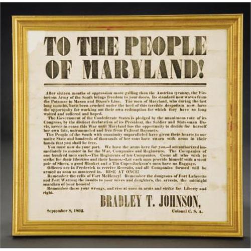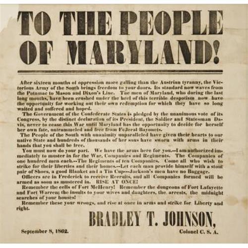 <B>RARE CONFEDERATE BROADSIDE GEN. BRADLEY T. JOHNSON OF MARYLAND 1862.</B></I> This is the only know Confederate broadside from Maryland issued by General Bradley T. Johnson. September 8, 1862. “<I>TO THE PEOPLE OF MARYLAND</B></I>.<I> After sixteen months of oppression more galling than the Austrian tyranny, the victorious army of the south brings freedom to your doors. Its standard now of Maryland, who during the last long months, have been crushed under the heel of this terrible despotism now have the opportunity for working out their own redemption for which they have so long waited and suffered and hoped</B></I>.” Very rare broadside calling for Maryland recruits to join the Confederate struggle, General Johnson, signs as “Colonel C.S.A.” as he exhorts his fellow Marylanders. <I>“You must now do your part… Remember the cells of Fort McHenry! Remember the dungeons of Lafayette and Fort Warren: the insults to your wives and daughters, the arrests, the midnight searches of your houses! Remember these wrongs, and rise at once in arms and strike for Liberty and right.”</B></I> Johnson would indeed raise one regiment of Marylanders and lead these very men in Jackson’s Valley Campaign. Exceedingly RARE broadside as there are not many Confederate Maryland Units. Purportedly four examples exist in institutions, this being the only one in private hands. Broadside measures 14.5” x 13.75”. Framed in gilded frame to an overall 16” x 15.5”. <BR><BR><B>Condition:</B></I> Very good-fine condition, some discoloration, light creases, has upper left corner missing approximately 1.25” x1.50” just touches letter “T”.<BR><BR><b>Shipping:</b> Framed - without Glass, Small (<a target="_blank" href="http://www.heritageauctions.com/common/shipping.php">view shipping information</a>)