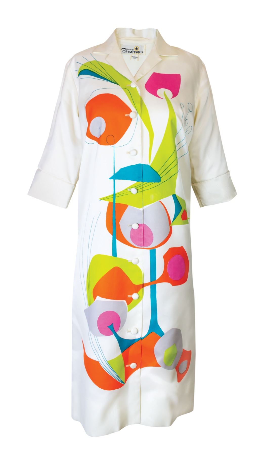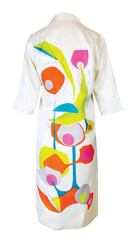 (1950s) An absolute stunner of an Alfred Shaheen dress! Features a stylized Modernist Mobile print which will surely turn heads at any Exotica parties you attend! Dress Chest 18" across, Waist 18" across, Length 39". VG+ with typical wear.
