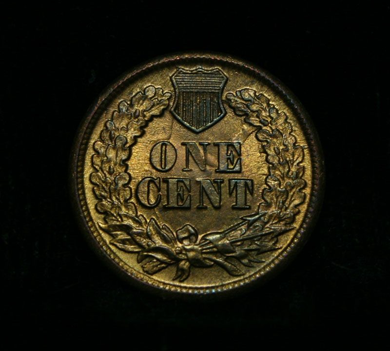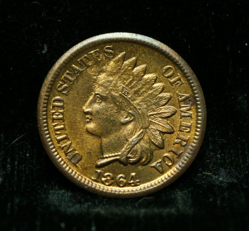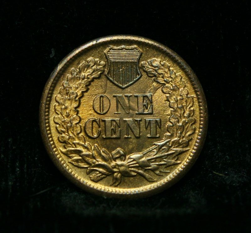 Wild and Gorgeous example. Even though it is a wonderful deep red color and has superior luster, I would still have to say that the wild Mint Error is the highlight of this coin. This Indian Cent was struck thru grease and it caused a very cool mint error. The dies did not fill fully and the coin is missing all of the letters is Miss Liberty's headband except for the "E". This Coin is exceptionally pretty and this mint error is highly sought after. I had never seen this before and had to do quite a bit of research to figure out the nuances of this coin. This is a very interesting error coin. PCGS's Price Guide lists a regular ms65RD at $1100. NGC's Price Guide lists a regular ms65RD at $1090. Estimated Value $1250