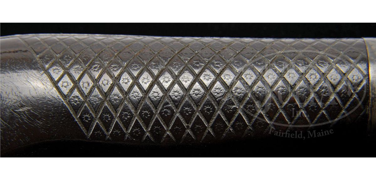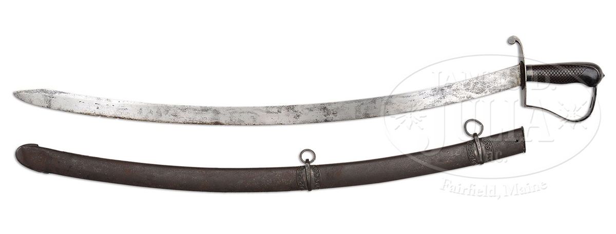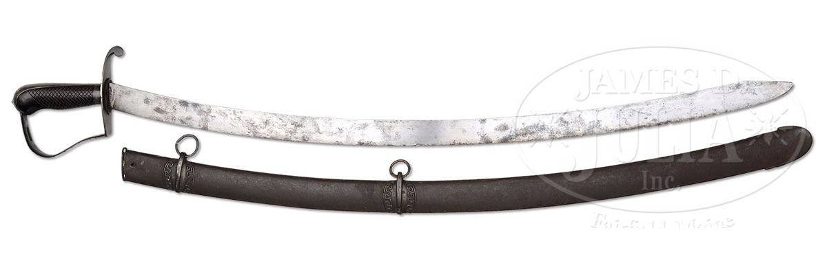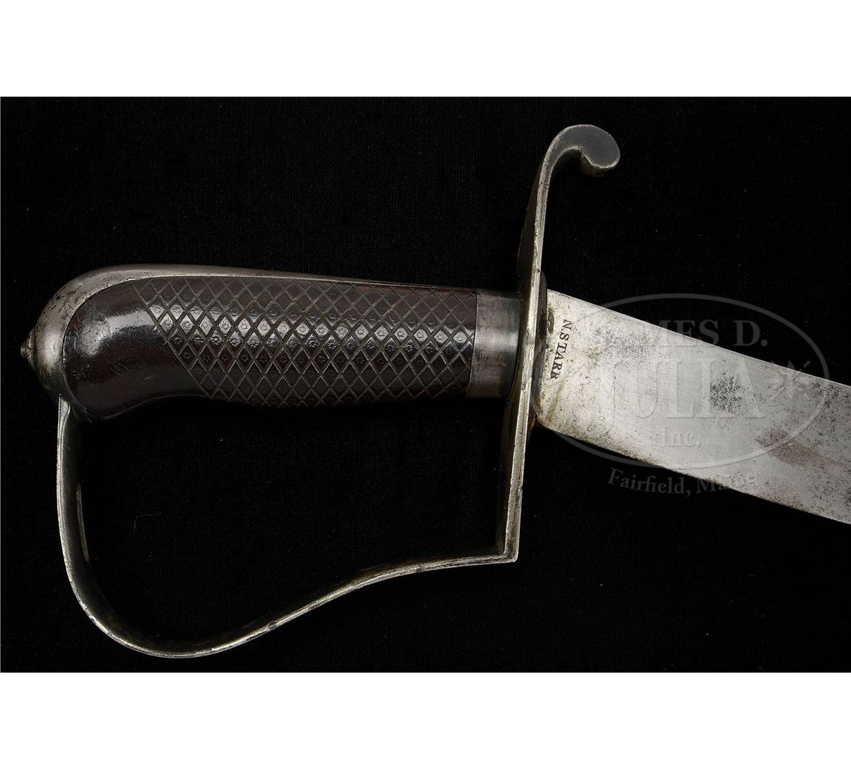 You are bidding on one of the rarest regulation American pattern swords known. This sword is new to market and never previously offered in auction. Consignor remembers sword in father's home forty years ago. This sword is orig, authentic, and "as found". Nathan Starr was contracted to build only 31 of this pattern and no more than 2 or 3 are known to this cataloger. Harold Peterson, in his treatise on American swords,"The American Sword," states, "Between August 3 and November 26, 1814, Nathan Starr delivered thirty-one silver plated officers' sabers to the Commissary General of Purchases. These swords were made at the behest of officers who wanted sabers of the same general pattern as their men but of a better quality. They cost twenty dollars as opposed to eight dollars for the standard saber, and the Commissary General was reimbursed for the extra cost by the men who received them. The saber illustrated is indeed one of these very rare and special arms. In all respects except the silver plating, the checkering of the grips and the small eight pointed stars stamped into each "diamond-shape" from cross hatching and the decorative bands on the scabbard, it resembles exactly the regular issue saber made by Starr under contracts of 1812 and 1813. Since these swords were white mounted, they would also have been appropriate for field officers of infantry. "The heavy curved blade is single-edged with a clipped point and a false edge that extends back about six inches. It is stamped "N STARR" on ricasso with four slash marks on opposite side. The grips are wood highly finished and checkered with a small pinwheel figure incised in the center of each lozenge formed by the checkering. All the metal parts of the hilt are made of iron covered with a layer of silver in the style of "Sheffield-plate". These parts consist of a ferrule at the base of the grips; a backstrap which surmounts the grips and expands to form a cover for the rounded "Bird's Head" stylized pommel; a knuckle-bow of the reverse P form which is pierced near the pommel for a sword knot; and a quillon which terminates above the blade in a disc. The tang of the blade is secured at the pommel by a small round spanner-nut. The scabbard is of iron, japanned black. There are two rings for suspension slings, and each of these is attached to the scabbard by bands of Sheffield plate embossed with the so-called "Wall of Troy" motif on "green key". There is a rudimentary drag at the tip. CONDITION: Blade is 35-1/2" long, white/gray with scattered pitting and staining. "N STARR" marking is well-struck. Checkered wood grip is very fine. Sheffield plate is 95% plus complete and very good overall. Silver scabbard mounts and throat are very good overall though throat is missing pinned attachment. Scabbard body shows light pitting under black japanning. Overall the sword is in very fine condition and throat pins are easily restored if wanted. 4-49247 JS209