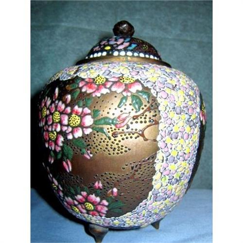 EXTREMELY FINE AND RARE DESIGN. THIS LIDDED JAR IS ONE OF THE FINEST PIECES OF MOREIAGE CLOISONNE I HAVE EVER OWNED. THE WORKMANSHIP ON THE METAL WORK IS DELICATE AND PRECISED. THE HANDLE ON THE LID IS A BUDDING FLOWER, ALONG WITH ALL THE METAL WORK IN THE THREE CARTOUCHES.THE DOT WORK DONE ON THE REST OF THE PIECE IS EXCEPTIONAL. MANY PIECES OF MOREIAGE THAT I HAVE SEEN, THE ARTIST NEVER WENT AS FAR INTO DETAIL AS THIS FINE ARTIST DID. STANDS ON THREE LEGS IN THE SHAPE OF TEAR DROPS. THE INSIDE IS FINISHED IN SOLID CLOISONNE. TRUELY A FINE, FINE PIECE.