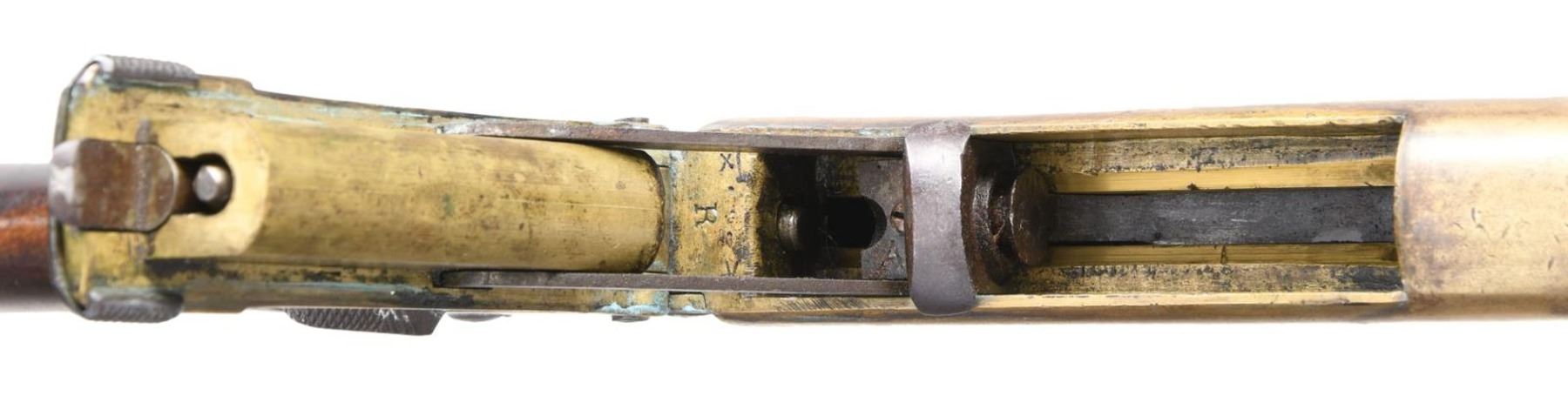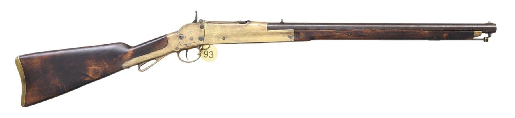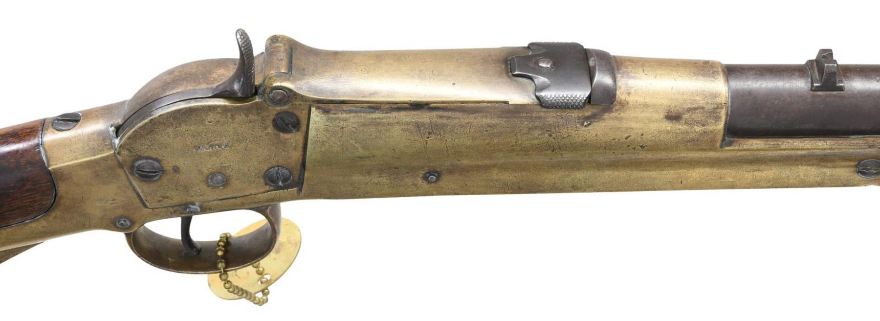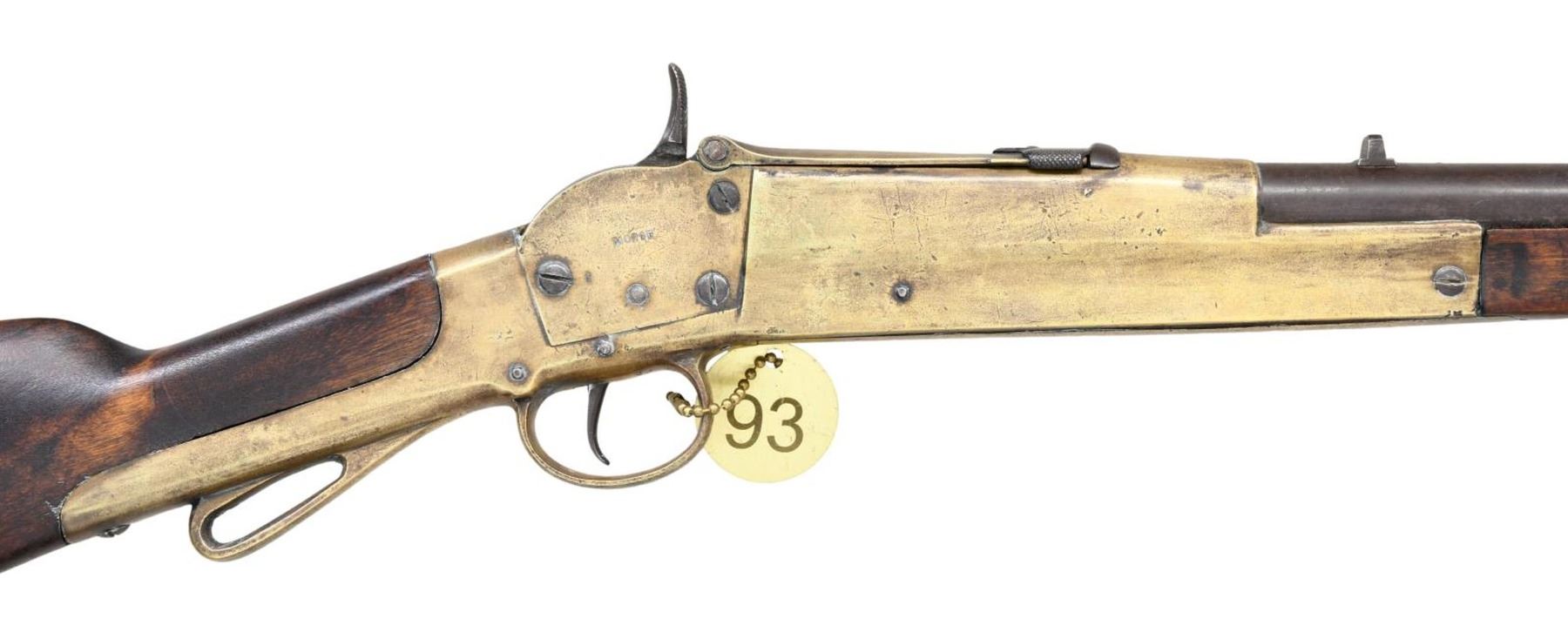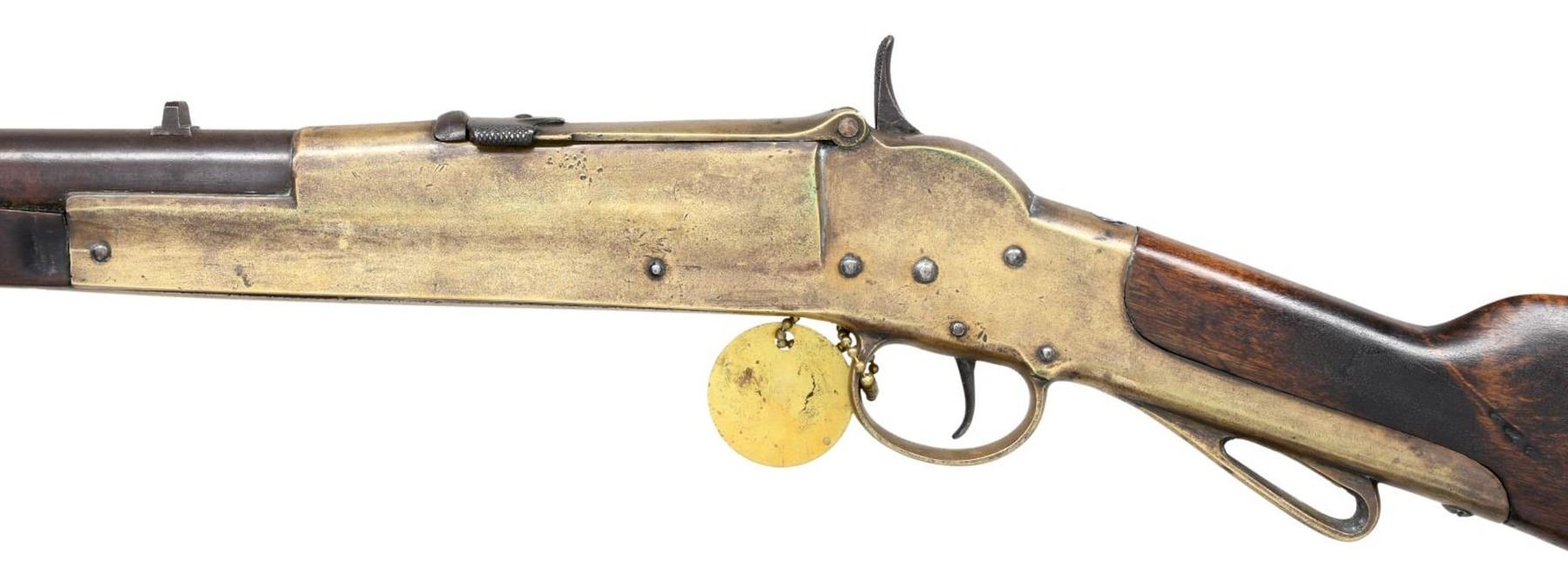 , Cal. 50. S# 995. Brass framed, breech loading Morse carbines were made in Greenville SC, 20" round barrel, 39.5" overall. About 1000 were made and only 4 or 5 examples are known marked "MORSE". These few marked guns are generally mixed numbers around serial number 1000. This is only example I am aware that is all matching and also the lowest serial number known marked "MORSE". These guns were issued to South Carolina Cavalry and most are in well used condition. This example shows honest use, but has survived complete and original, still retaining threaded brass cleaning jug fitted in the butt plate. UNATTACHED ACCESSORIES: copy of Morse chapter from Madaus & Murphy. CONDITION: very good overall, brass is cleaned and toned to a mottled light mustard patina, iron has smooth brown patina. Carbine will not hold on full cock, otherwise mechanics are fine, good crisp rifled bore. PROVENANCE: Private Southern collection. (01-24682/JS). ANTIQUE. $25,000-30,000.