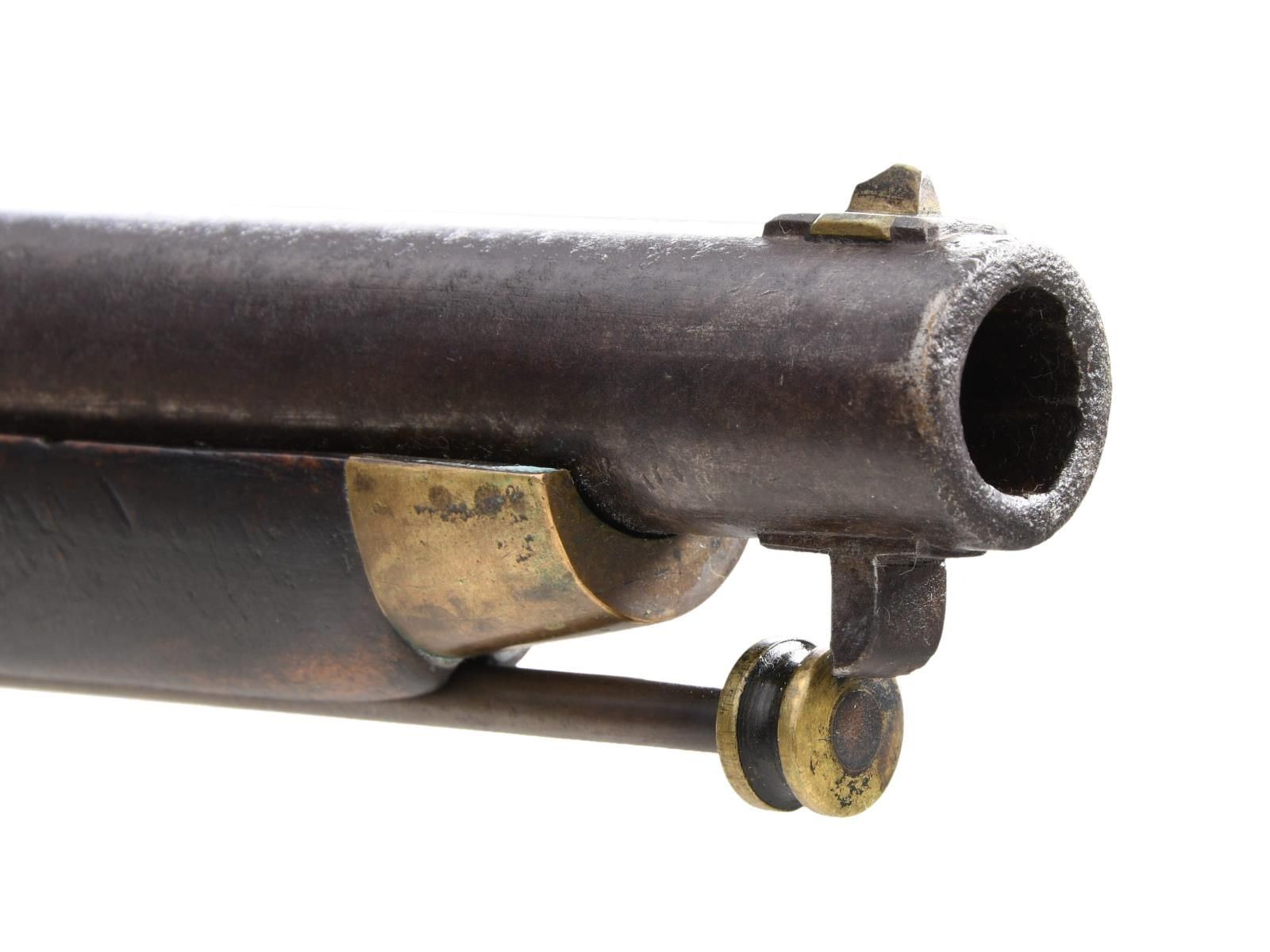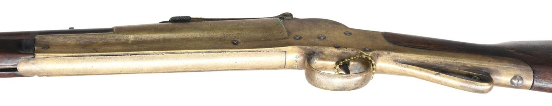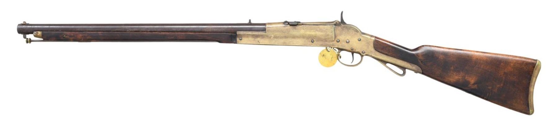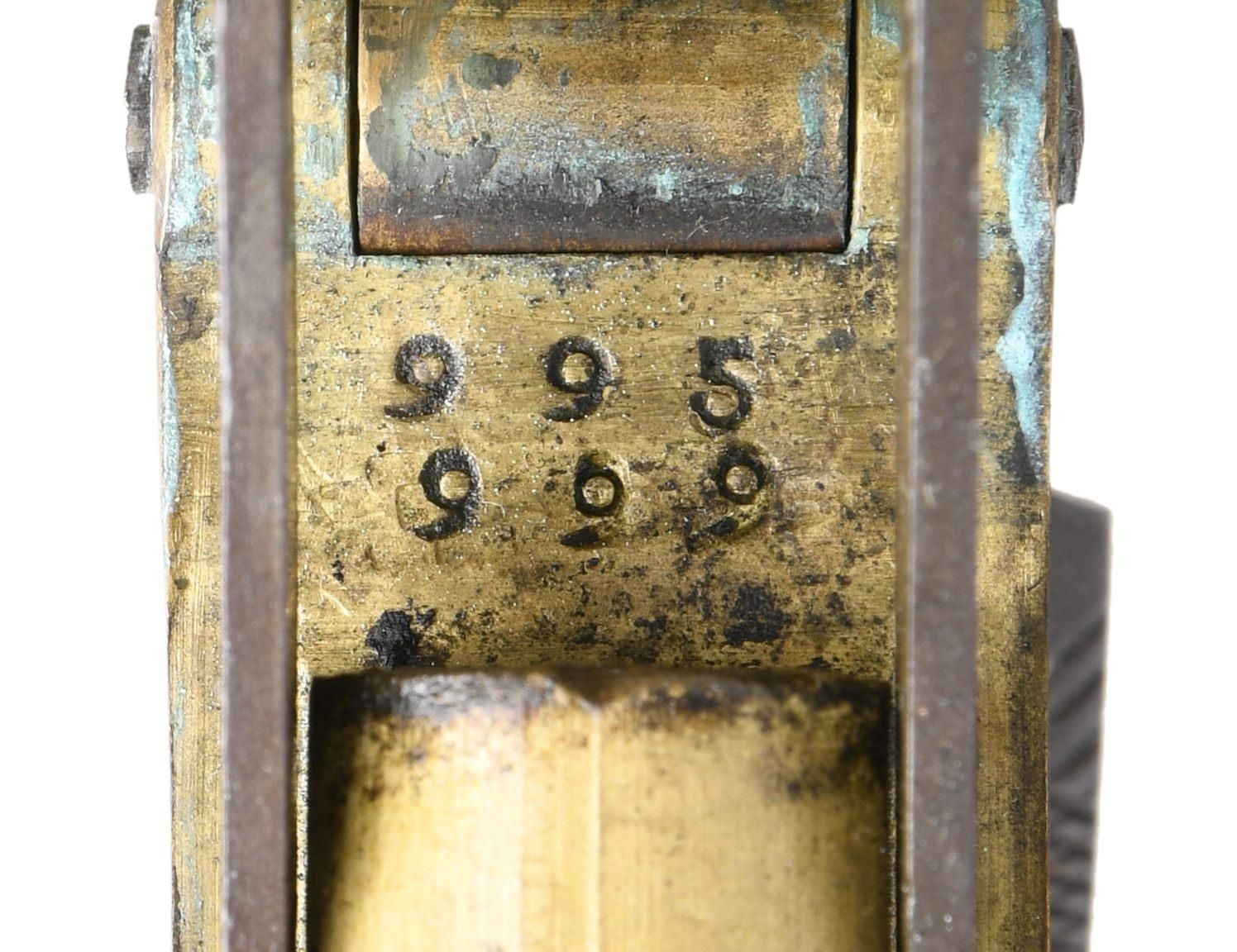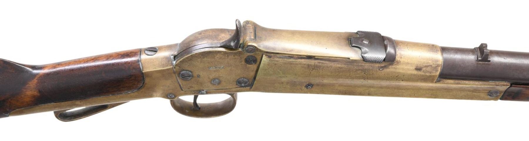 , Cal. 50. S# 995. Brass framed, breech loading Morse carbines were made in Greenville SC, 20" round barrel, 39.5" overall. About 1000 were made and only 4 or 5 examples are known marked "MORSE". These few marked guns are generally mixed numbers around serial number 1000. This is only example I am aware that is all matching and also the lowest serial number known marked "MORSE". These guns were issued to South Carolina Cavalry and most are in well used condition. This example shows honest use, but has survived complete and original, still retaining threaded brass cleaning jug fitted in the butt plate. UNATTACHED ACCESSORIES: copy of Morse chapter from Madaus & Murphy. CONDITION: very good overall, brass is cleaned and toned to a mottled light mustard patina, iron has smooth brown patina. Carbine will not hold on full cock, otherwise mechanics are fine, good crisp rifled bore. PROVENANCE: Private Southern collection. (01-24682/JS). ANTIQUE. $25,000-30,000.