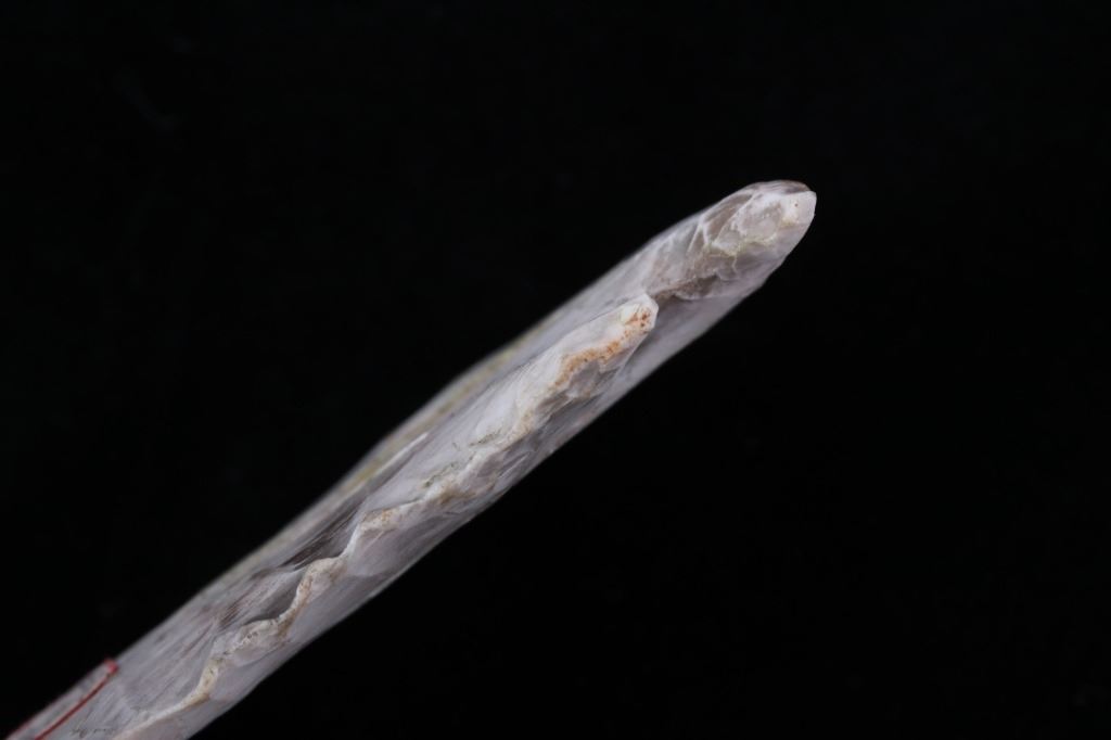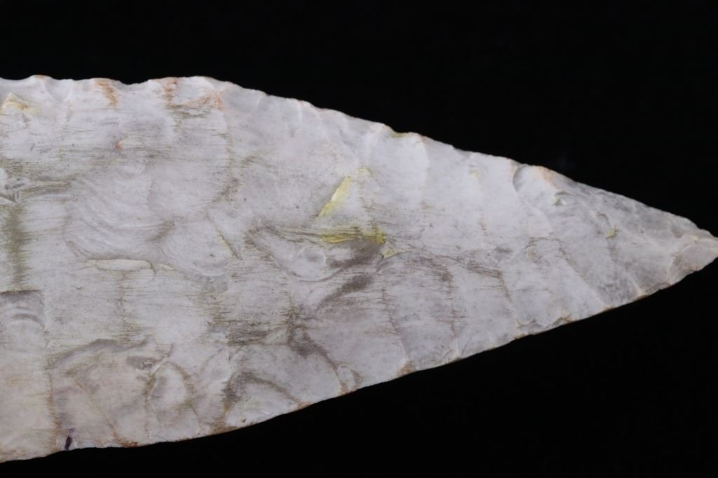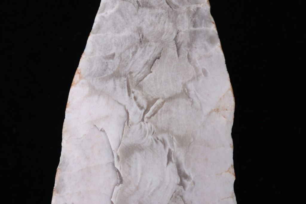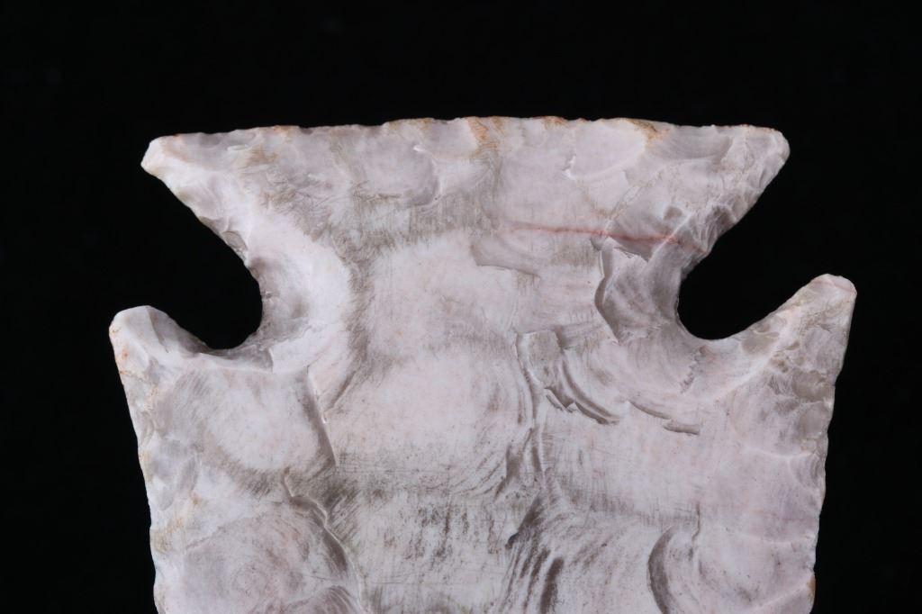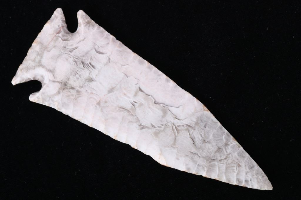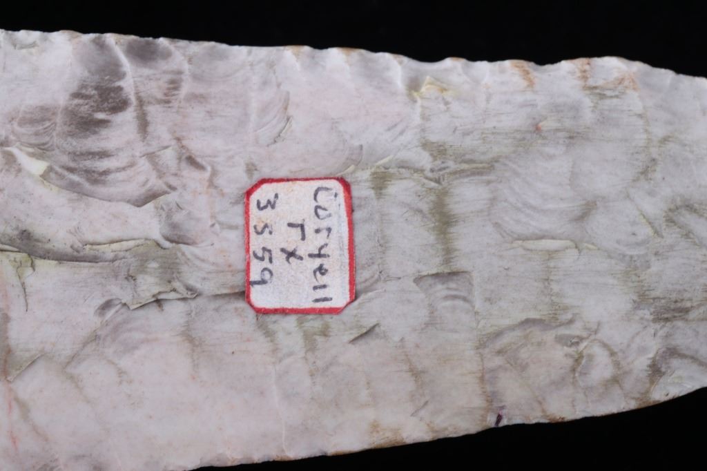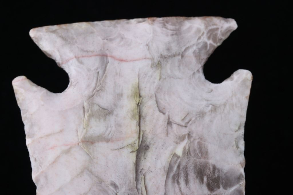 This is an outstanding large authentic pre-historic notched Marcos spear point with a fine grade of G-8 and a book value of $2,500. The ancient point is expertly constructed from a fine Flint Ridge material with outstanding coloring and is in very well-preserved excellent museum quality condition. The point shows a large / tall Marcos spear point with nice notching. The spear point has a collection museum tag that reads, “185-A18 Marcos 5 1/8” Flint Point Coryell, Co. Tx. Book Value $2,500.00” and “5 1/8 Marcos G-8 Value 2,500 Coryell CO TX”. This is truly a rare authentic unusual rarely seen Marcos spear point with wonderful condition and color of white and pink to light red with a finish of black/grey to green and was collected in Texas. This 2,600-1,800 B.P. artifact is from the Texas Native American Indians and is in exceptionally fine spear point showing wonderful detail and an extraordinary size. Provenance: From a multi-generation artifact collection spanning 80-100 years from Las Cruzes, New Mexico. The point is in excellent condition and measures 5 1/8”L x 2”W. Riker case is 5.25”x6.25” and 1” thick. The point has an original collection museum tag on the piece itself of an older age. This is one of the largest Marcos points in such a high grade offered for sale.