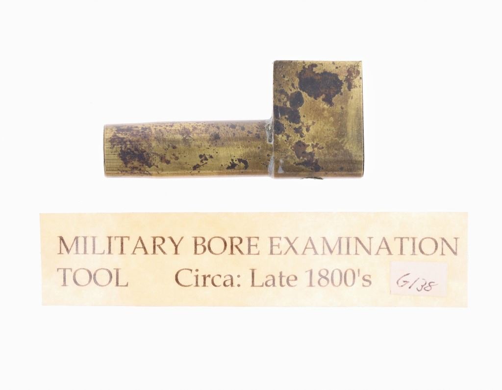 Featured in this lot is this Rare military Rifle Bore examination tool circa 19th century; Provenance: From the Tombstone Western Heritage Museum in Tombstone, Arizona. This bore examination tool was displayed in the Tombstone Western Heritage Museum and identified as a pre World War with examples found of M1 Garand bore examination tool but is attributed as being from the 19th century. The condition of this Milittary Bore Examination tool is good with no obvious signs of damage and shows a good overall condition. The measurements of this bore examination tool is 2 1/4" x 1". The collective weight of this tool is U4oz. G135