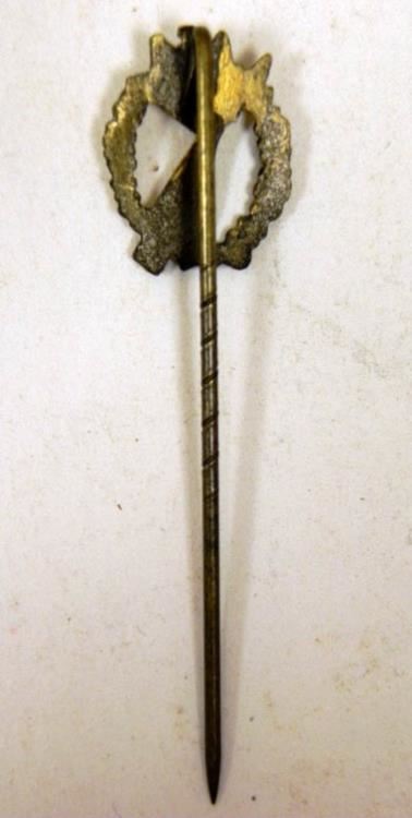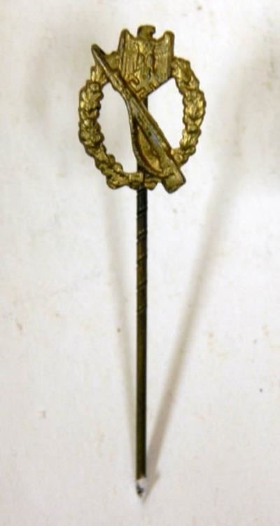 HERE IS A RARE NAZI INFANTRY ASSAULT BADGE STICK-PIN-ORIG-BRONZE GILT COLOR. IT HAS A KNURLED BACK PIN.
