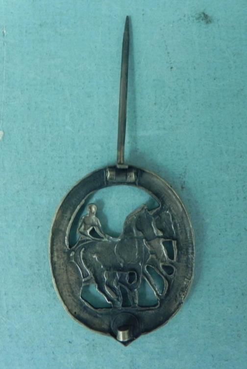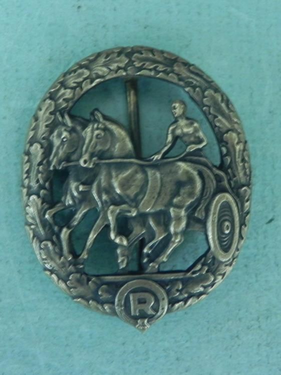 RARE NAZI RIDER'S COMPETITION AWARD BADGE IN BRONZE SHOWS EQUESTRIAN WITH TWO HORSE TEAM WITH AN OAK LEAF BORDER WITH "R" IN A CIRCLE AT BOTTOM - HINGED PIN-BACK