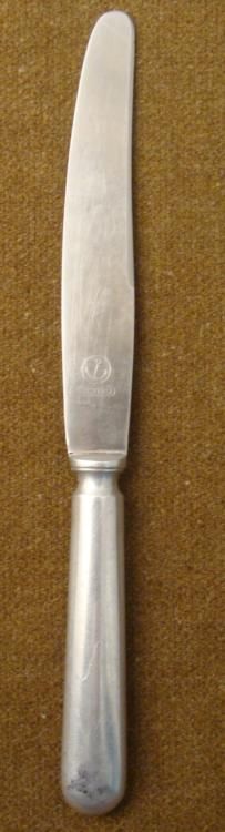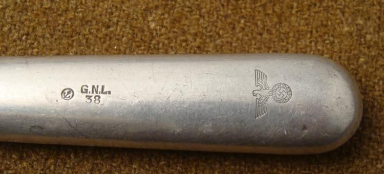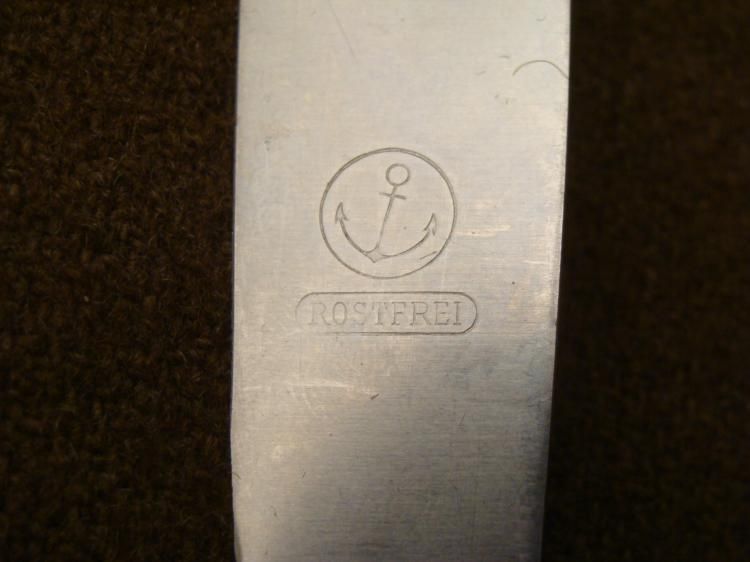 THIS IS A RARE ORIGINAL NAZI WEHRMACHT DINING HALL KNIFE, WITH AN ENGRAVED EAGLE & SWASTIKA. IT HAS ANCHOR LOGO OF MAKER AND GNL 38 ON HANDLE & THE ANCHOR LOGO ON THE BLADE. THE KNIFE IS ALSO STAMPED ROSTFREI (STAINLESS) AND MARKED 1938. *