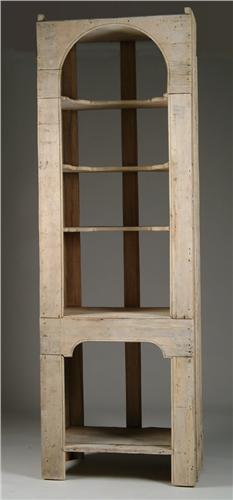 RARE NEW ENGLAND QUEEN ANNE BUILT-IN CUPBOARD. This one piece 18th Century cupboard has open front in two sections. The top section fitted with three shaped shelves, which are fastened with rosehead nails and mortised into back boards. The front face has molded edge with semi-circular top. A central shelf below which is an open area with shaped molded facing with bottom shelf. All supported on cutout legs. Very light white colored wash to surface. The interior sides have simulated molded edge panel and back with similar molding. The back is open which may have had panels or plaster backing. SIZE: 89-1/2in. h x 29-1/4in. w x 19-1/2in. d. CONDITION: Leg areas have some old repairs but generally very good. 9-26176