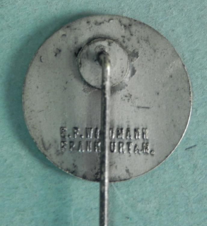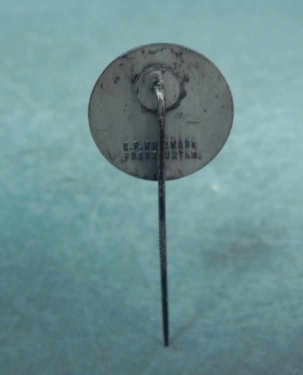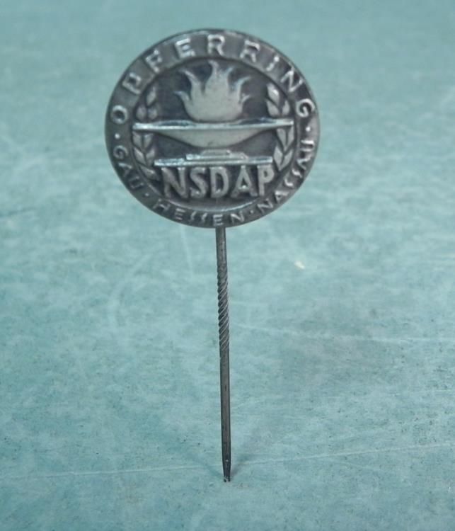 RARE NSDAP GAU HESSEN OPFERRING STICKPIN-MAKER MKD ORIGINAL RARE NSDAP (NAZI PARTY) STICKPIN-VET BRINGBACK-GAU HESSEN NASSAU-DIAMETER 3/4"--REVERSE MARKED "E F WIEDMANN-FRANKFURT am"