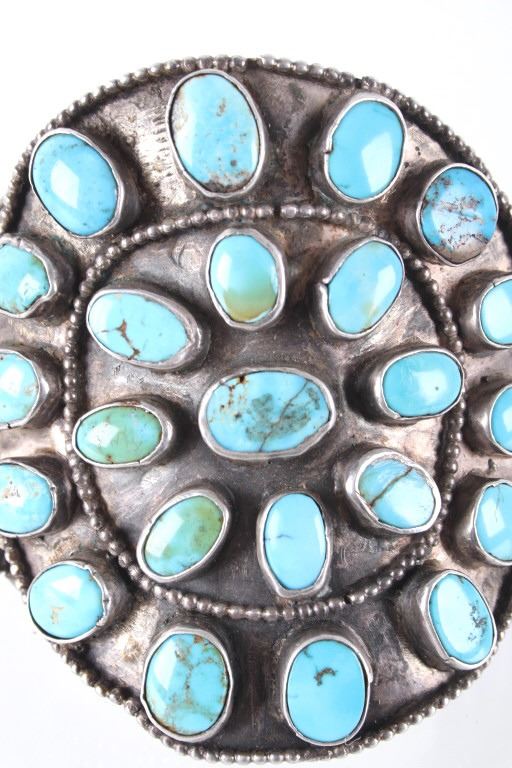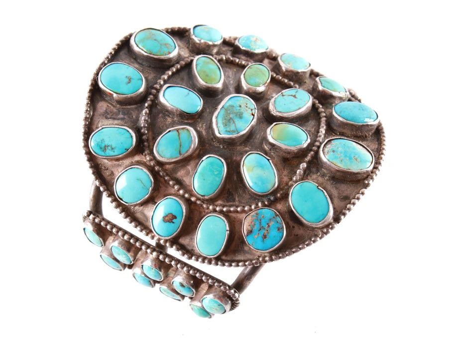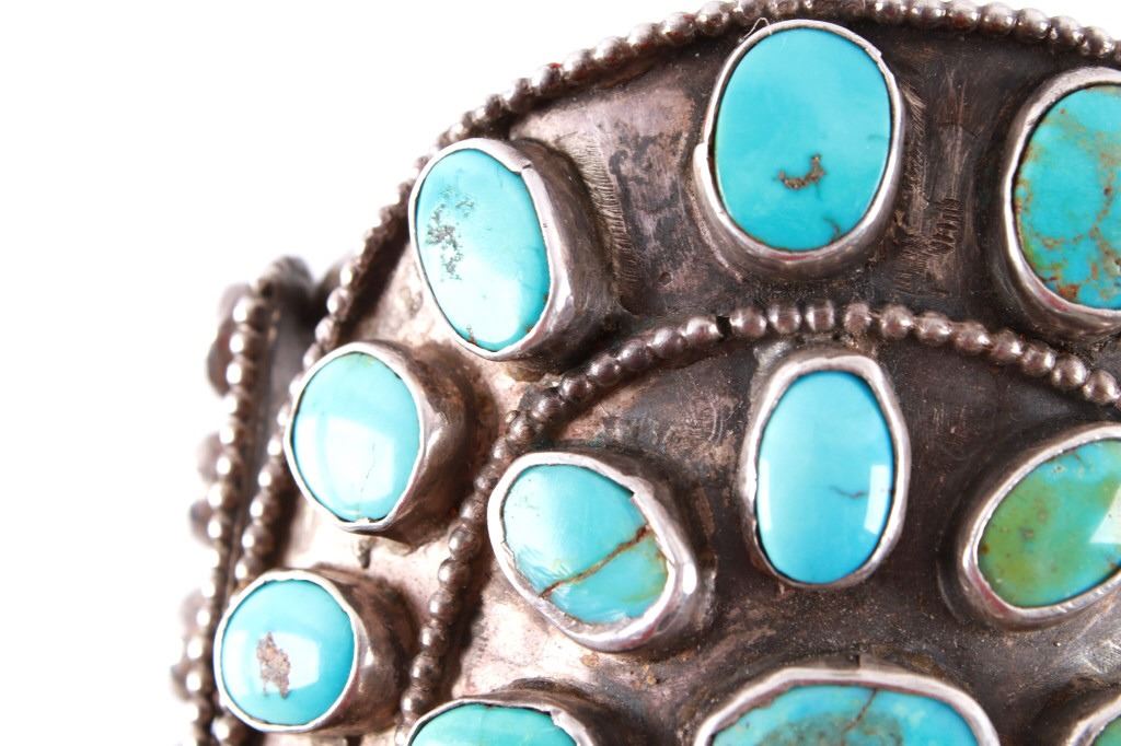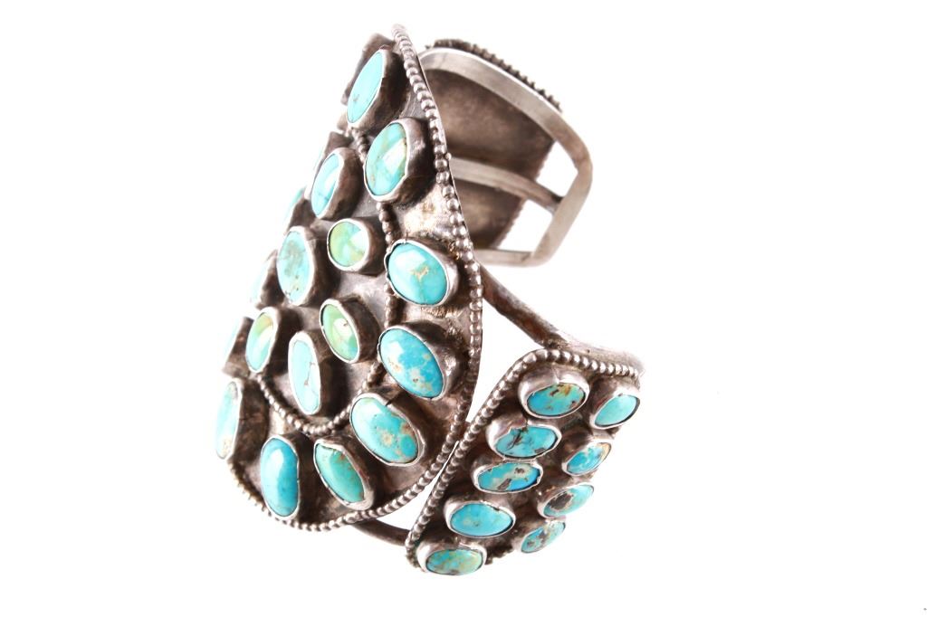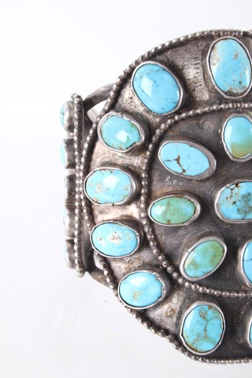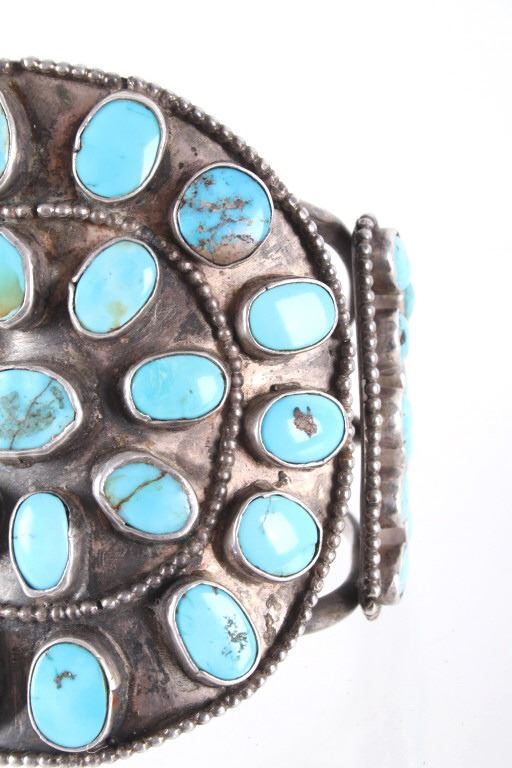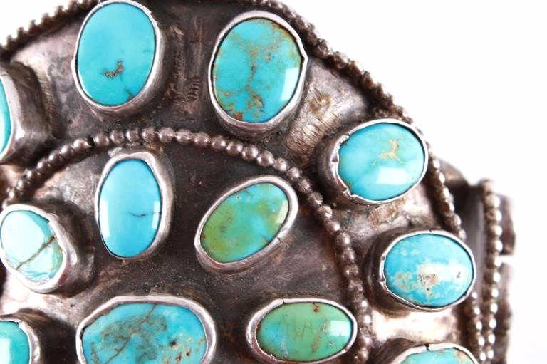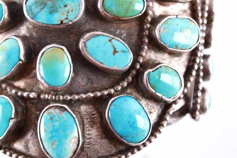 Featured in this lot is this rare and large Navajo "Old Pawn" coin silver and turquoise bracelet, circa 1930's. The bracelet features heavy, old pawn coin silver with a large bracelet face and a triple coin silver plate construction with 41 inlaid cripple creek oval cut turquoise cabochons. This is a beautiful handmade piece showing a highly collectable design to the bracelet. The condition of this bracelet is good, with no obvious signs of damage. The measurements of this bracelet are 2" x 3 1/4" x 3 1/4" and a circumference of 5". The collective weight of this bracelet is 168.3 g.