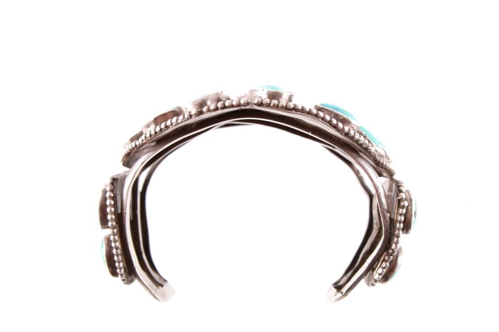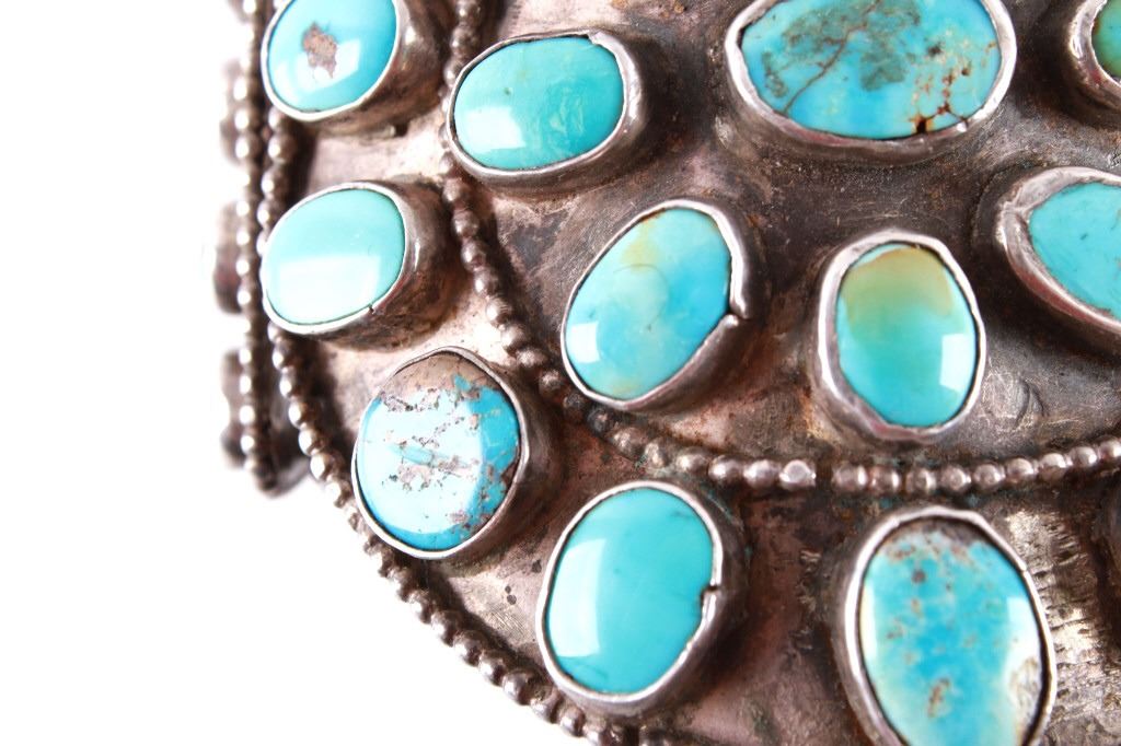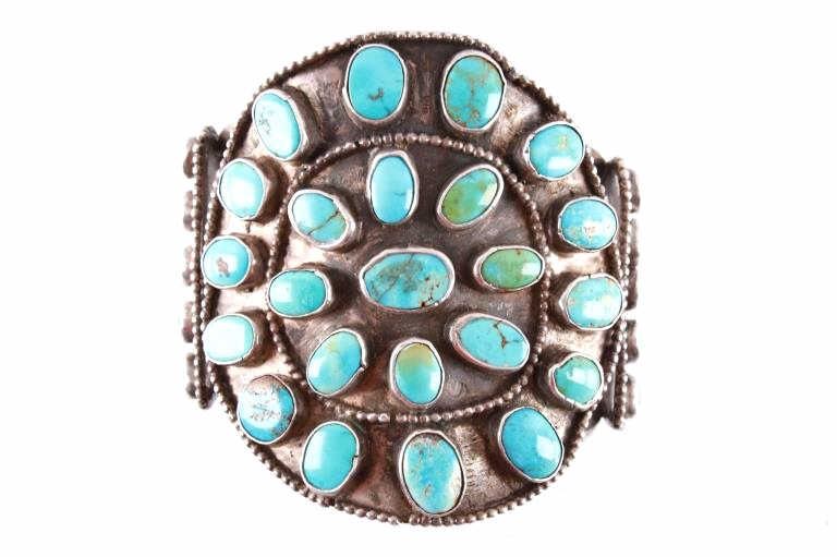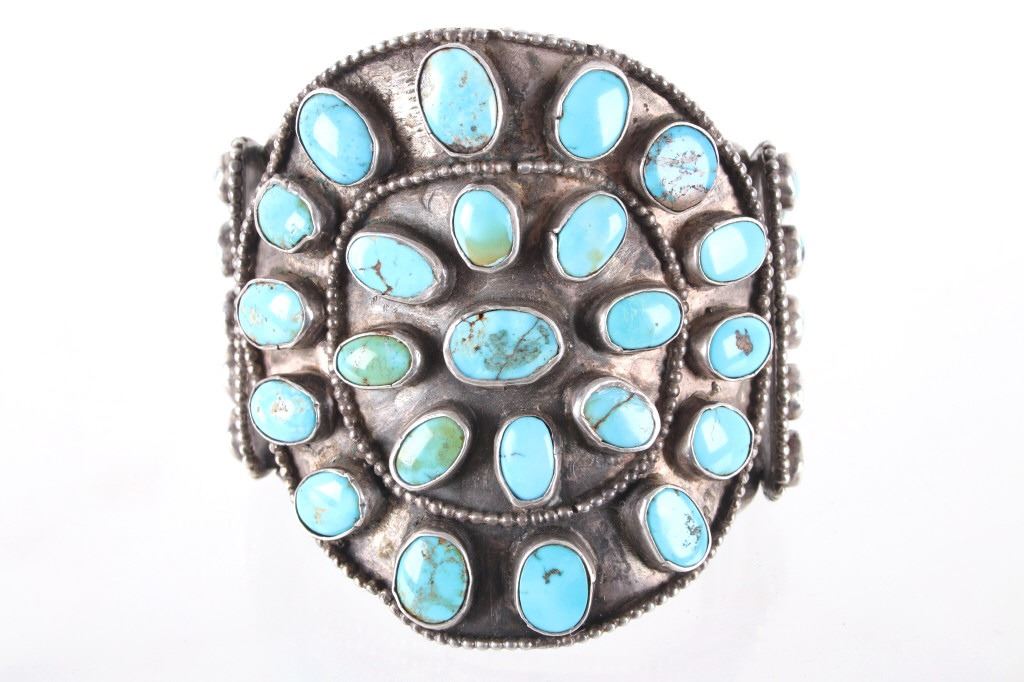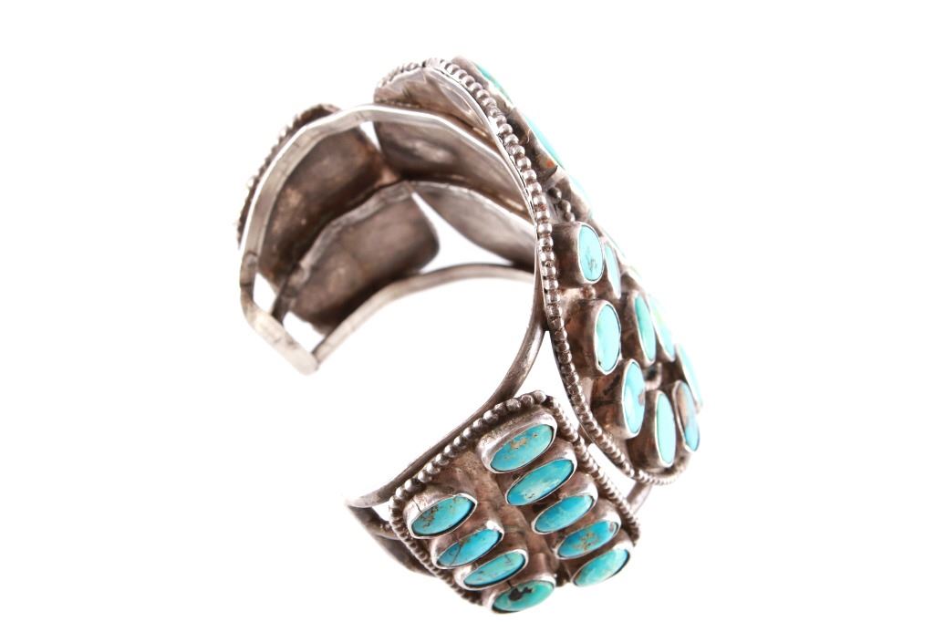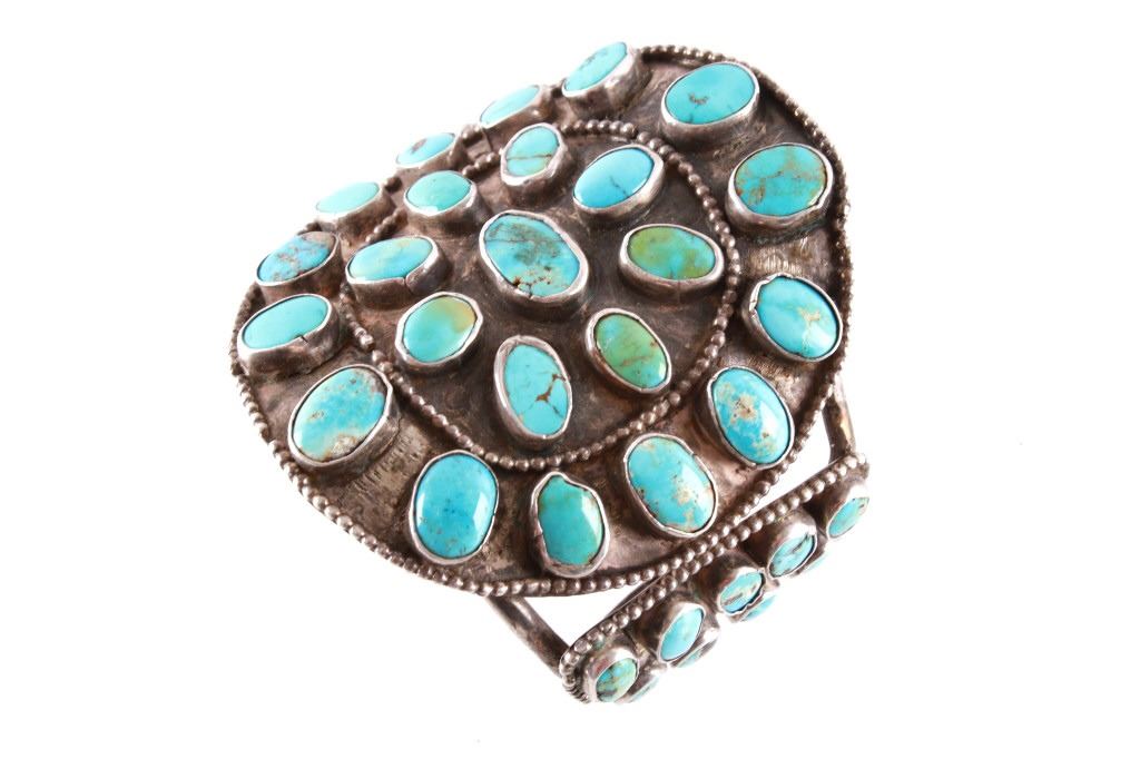 Featured in this lot is this rare and large Navajo "Old Pawn" coin silver and turquoise bracelet, circa 1930's. The bracelet features heavy, old pawn coin silver with a large bracelet face and a triple coin silver plate construction with 41 inlaid cripple creek oval cut turquoise cabochons. This is a beautiful handmade piece showing a highly collectable design to the bracelet. The condition of this bracelet is good, with no obvious signs of damage. The measurements of this bracelet are 2" x 3 1/4" x 3 1/4" and a circumference of 5". The collective weight of this bracelet is 168.3 g.
