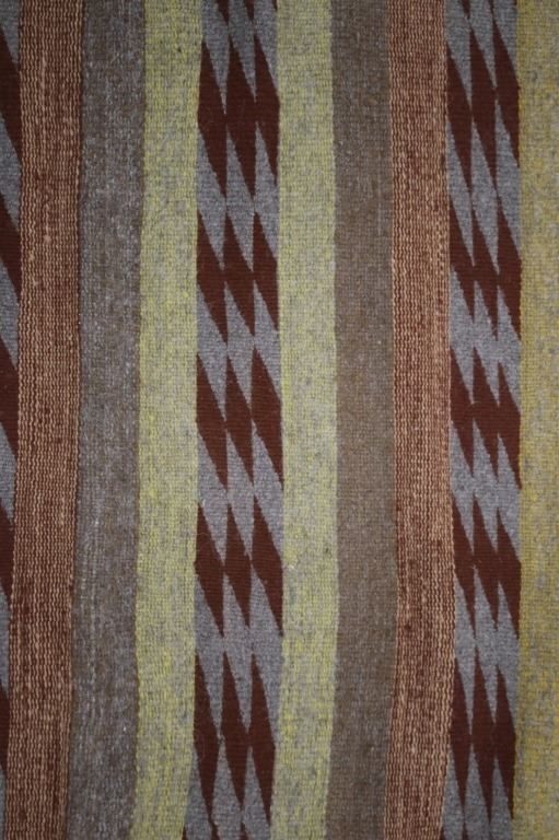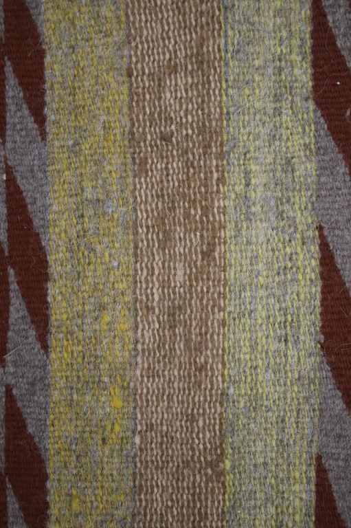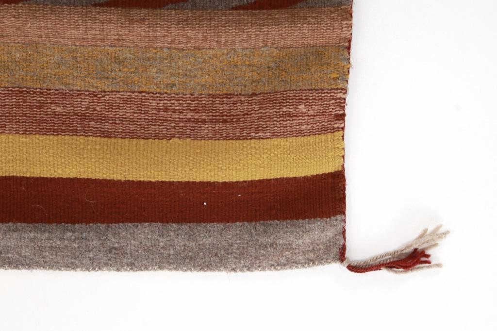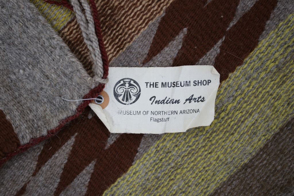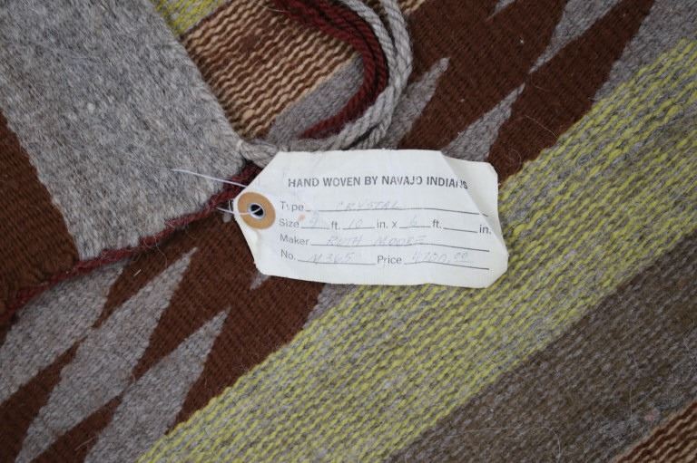 This is an exceptional hand-knotted and hand-spun wool rug from Navajo / Dine artist, Ruth Moore, circa 1970-1980s. The size of the rug is almost 10 foot by 6 foot (118 1/4" x 70 1/2"). The rug is from a museum collection and is accompanied by an original museum tag which is marked, “The Museum Shop Indian Arts Museum of Northern Arizona Flagstaff” on the front and handwritten on the back, “Type: Crystal / Size: 9 ft 10 in. x 6 ft. / Maker: Ruth Moore / No. M365 Price $4,700.00”. $4,700 in 1975 to 1980 would be the equivalent of $26,500 to $17,300 in today's money. For another example of a Ruth Moore rug see the large Navajo Crystal in earth-tones offered for sale in 2007 and 2008 by Altermann Galleries with an estimate of $4,500 to $5,500 (with our example having a similar accompanying tag with museum provenance and that example being attributed but not confirmed). The rug features a wonderfully and professionally crafted wool construction showing hand-spun natural wool that shows an original tag present. The rug features banded and stepped decorations with a traditional pine springs design and all four tassels are present. The overall condition of this rug is good with no obvious signs of damage. The piece has a fine tight weave with both natural, mineral dyes and aniline dyes. This is a collector grade rug with museum provenance. The measurements of this rug are 118 1/4" x 70 1/2".*