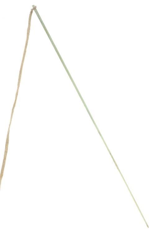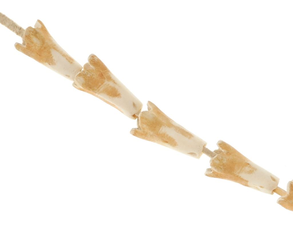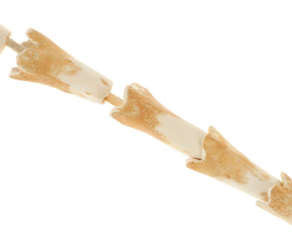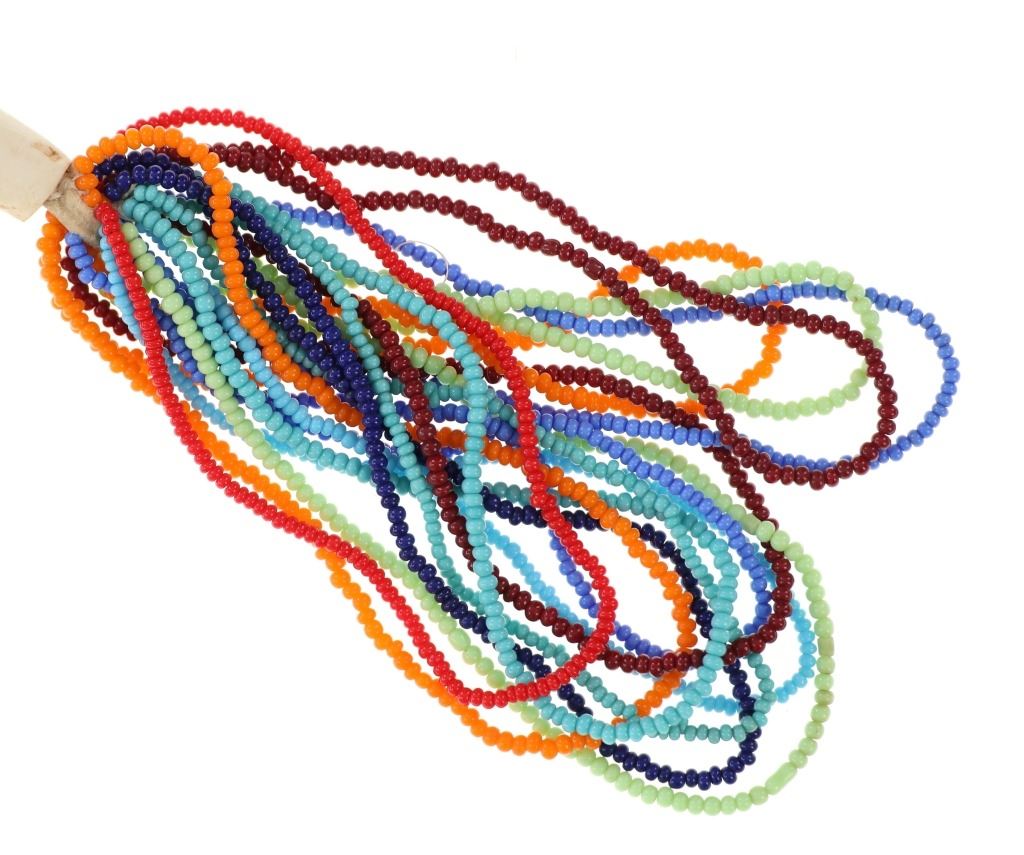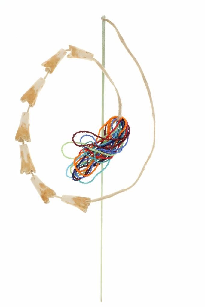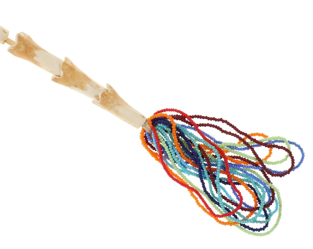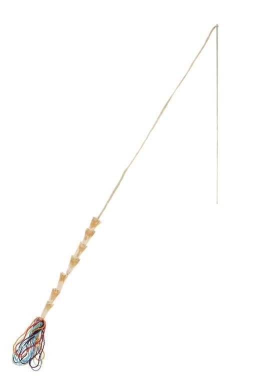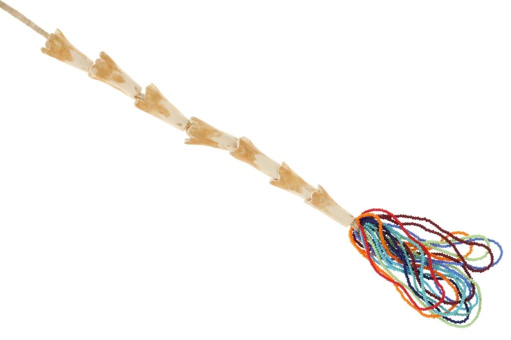This is a Northern Plains pin and bone gambling game made from deer bones with a beaded end from the 20th-century. The game goes by many names include the Cup and Pin Game of the Oglala Sioux, Rings and Pins called Tashea from the Assiniboine, ring and pins called Tasiha unpi from the Sioux, rings and sticks called netohenestotse from the Northern Cheyenne, a game with ring and sticks called Tsikonai ikoshnikia ring from the Zuni, ball an pin from the Ojibwe, knuckle bone game from the Plains, as well as hoof and pin from the Plains. This is likely the ring and pin game from the Sioux (Oglala or Lakota) called Tasiha unpi which shows phalangeal bones of deer with beaded end and long needle, an illustration from the Montana Office of Public Instruction Indian Education For All paper is included for reference. This example shows an Indian tanned hide strand with seven deer bones with carving showing a multistrand of colorful glass trade seed beadwork on one end and a long pointy green needle tied on the other end. Measures overall 47-inches long.