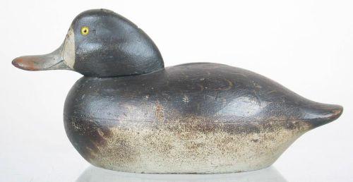 RARE. ONE OF MASON'S BEST DESIGNS. A Mason Low-Head Premier Grade bluebill hen in strong bold original swirl paint. Struck by a few shot. Minor paint wear to wood on the bill and top of the head. Provenance: Pitt Collection.