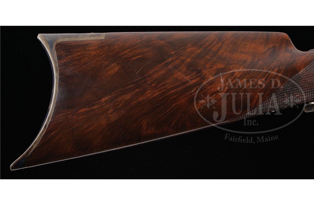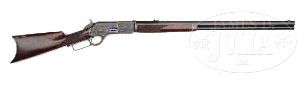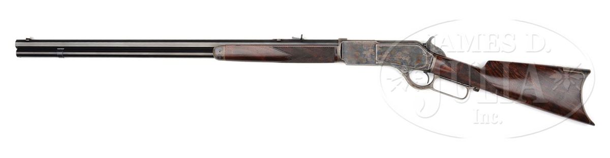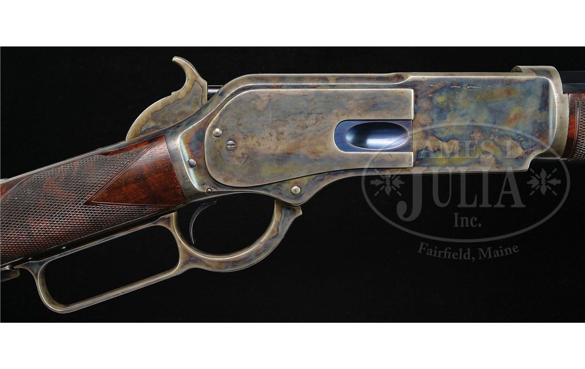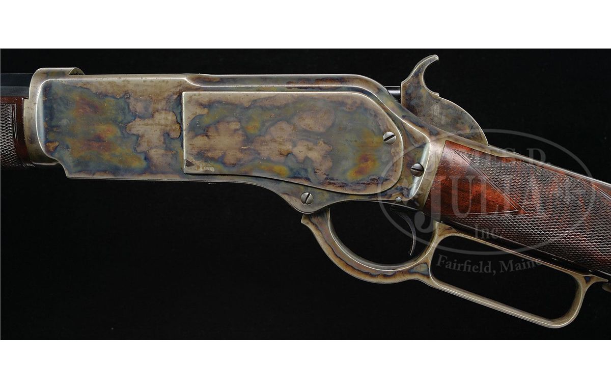 SN 986. Cal. 45-75. Beautiful deluxe rifle with 28" oct bbl, full magazine with half nickel front sight and early, short semi-buckhorn rear sight with checkered edges. Receiver is very early, made without rail for dust cover. Mounted with very highly figured, center crotch, flame grain American walnut that has early style flat checkered forearm & straight stock with the first type heavy crescent buttplate with trap. Left side of lower tang is marked "XXX" and the assembly number "92", which number is also found in top tang channel of buttstock and inside toe of buttplate. Bbl is either a modern Turnbull replacement or has had the address re-rolled. Wood is modern replacement, probably from Turnbull Restorations. Metal finish is also restored, probably also from Turnbull Restorations. Accompanied by a Cody Firearms Museum letter which identifies this rifle as case hardened, oct bbl, plain trigger & checkered wood received in warehouse Dec. 27, 1877 and shipped same day to Order #10852. Standard bbl length for Model 1876 rifles was 28". CONDITION: Very fine. Overall retains virtually all of its beautiful factory style restored finish with bright blue on bbl & magazine tube and bright orig style case colors on receiver, lever, hammer, forend cap & buttplate. Wood is extremely fine with a few light storage & handling nicks & scratches and retains virtually all of its crisp custom finish. Mechanics are crisp, brilliant shiny bore. Probably unfired since restoration. 4-48889 JR129