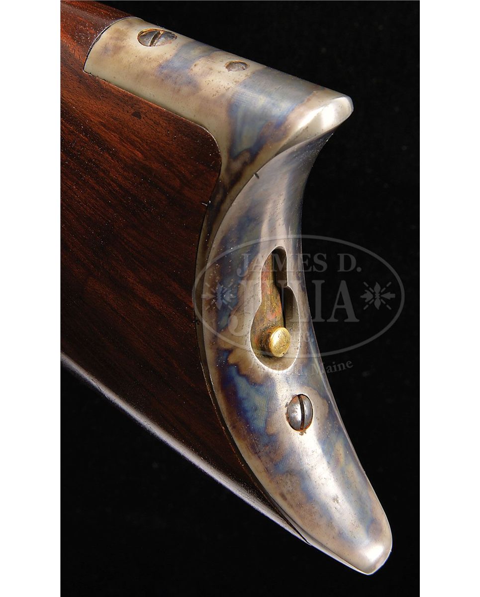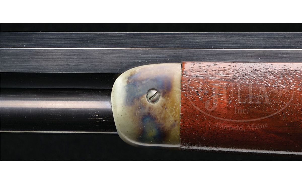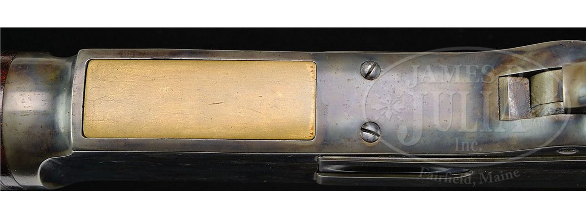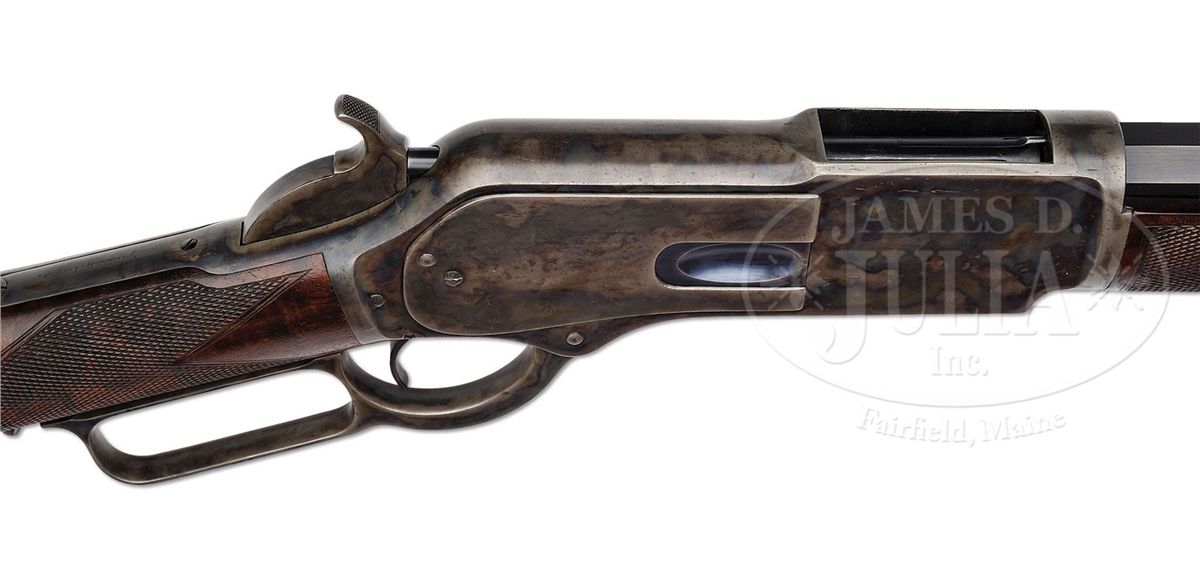 SN 986. Cal. 45-75. Beautiful deluxe rifle with 28" oct bbl, full magazine with half nickel front sight and early, short semi-buckhorn rear sight with checkered edges. Receiver is very early, made without rail for dust cover. Mounted with very highly figured, center crotch, flame grain American walnut that has early style flat checkered forearm & straight stock with the first type heavy crescent buttplate with trap. Left side of lower tang is marked "XXX" and the assembly number "92", which number is also found in top tang channel of buttstock and inside toe of buttplate. Bbl is either a modern Turnbull replacement or has had the address re-rolled. Wood is modern replacement, probably from Turnbull Restorations. Metal finish is also restored, probably also from Turnbull Restorations. Accompanied by a Cody Firearms Museum letter which identifies this rifle as case hardened, oct bbl, plain trigger & checkered wood received in warehouse Dec. 27, 1877 and shipped same day to Order #10852. Standard bbl length for Model 1876 rifles was 28". CONDITION: Very fine. Overall retains virtually all of its beautiful factory style restored finish with bright blue on bbl & magazine tube and bright orig style case colors on receiver, lever, hammer, forend cap & buttplate. Wood is extremely fine with a few light storage & handling nicks & scratches and retains virtually all of its crisp custom finish. Mechanics are crisp, brilliant shiny bore. Probably unfired since restoration. 4-48889 JR129