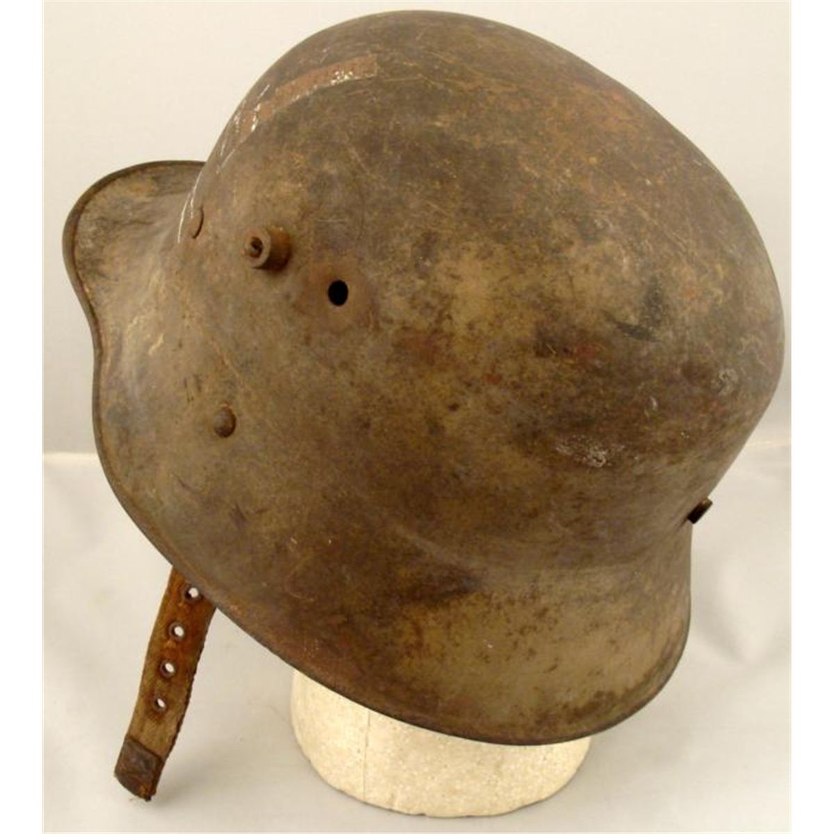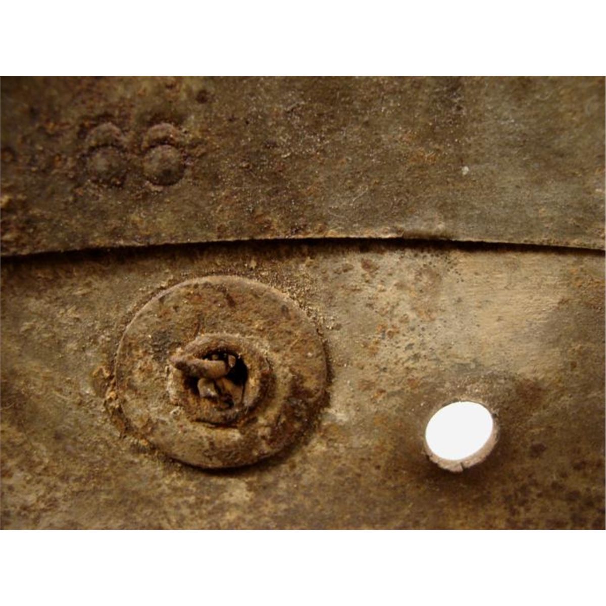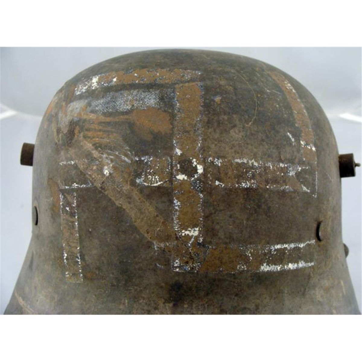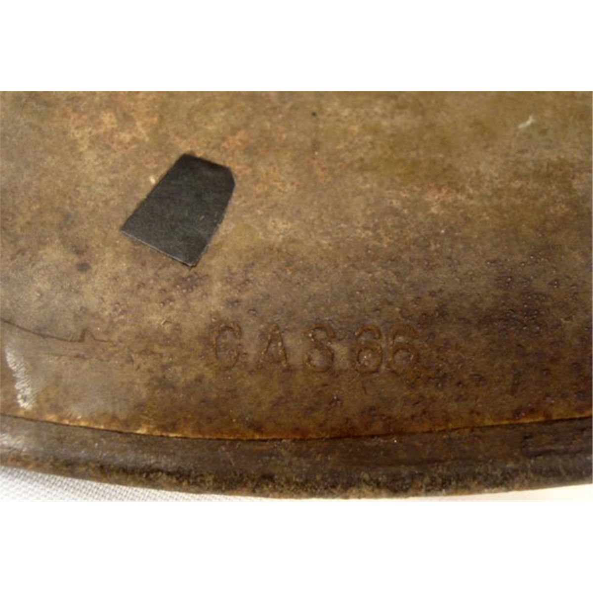RARE ORIGINAL M16 EARLY NAZI FREIKORPS HELMET W/SWASTIKA PAINTED IN FRONT-BULLET HOLE ON SIDE OF HELMET-C.A.S.66 * EXTREMELY RARE EARLY ORIGINAL NAZI WWI M16 "FREIKORPS" HELMET WITH LARGE (REVERSED) SWASTIKA PAINTED IN FRONT (AGE FADED)-FREIKORPS WAS AN EARLY NAZI PARTY MEMBER GROUP FROM THE 1920'S & 30'S. (SEE REFERENCE BOOK GERMAN HELMETS BY GOODAPPLE-VOL 1-PG 136). HELMET HAS ALL RIVETS AND INSIDE RIM, BUT NO LEATHER. STAMPED C.A.S.66---GREEN IN COLOR--HAS BULLET HOLE ON LEFT SIDE--RARELY SEEN ORIGINAL *