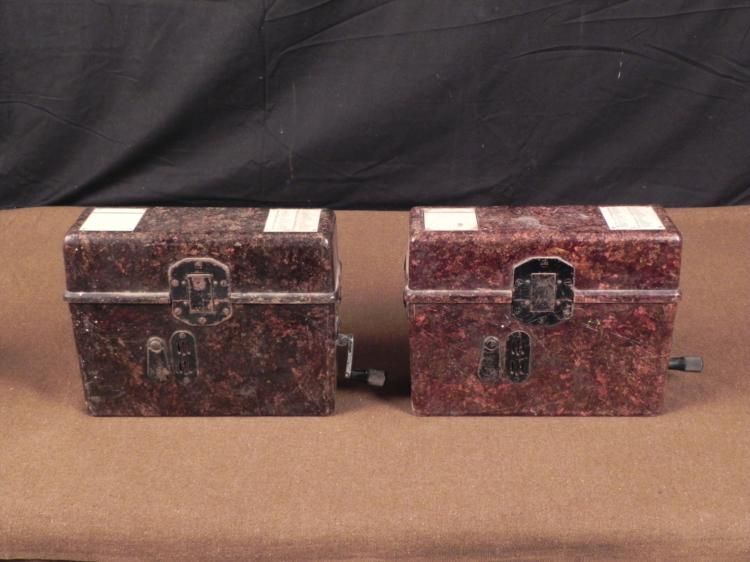 RARE ORIGINAL PAIR OF 1941 NAZI FIELD PHONES-COMPLETE WAFFENAMT-MAKER MARKEDOUTSTANDING RARE OFFERING OF TWO ORIGINAL NAZI WEHRMACHT 1941 COMBAT FIELD PHONES-WIND UP CRANK ON SIDES-HANDSETS AND WIREING PRESENT-BROWN BAKELITE CASES--ONE MARKED "ST & CO 1941" OTHER MARKED " R&B CO 41"--BOTH HAVE NAZI WAFFENAMT EAGLES-LATCHES ON CASES BOTH WORK-GREAT GUARANTEED ORIGINAL U.S. GI BRINGBACKS