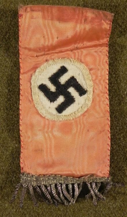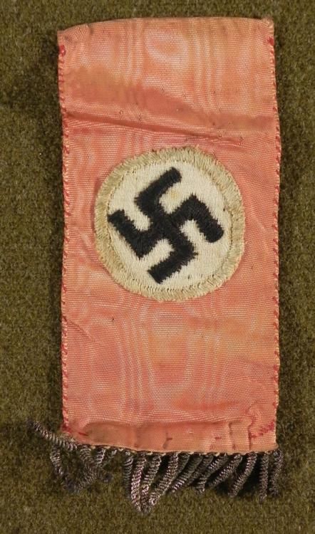 RARE ORIGINAL SMALL NAZI FLAG -SILK W/SWASTIKA & BULLION FRINGE * NEVER SEEN ON LIKE THIS BEFORE--5" LONG & 2" WIDE WATER LINED SILK WITH EMBROIDERED CIRCLE W/SWASTIKA -SILVER BULLION FRINGE ON BOTTOM.-ROSE COLORED-DOUBLE SIDED *