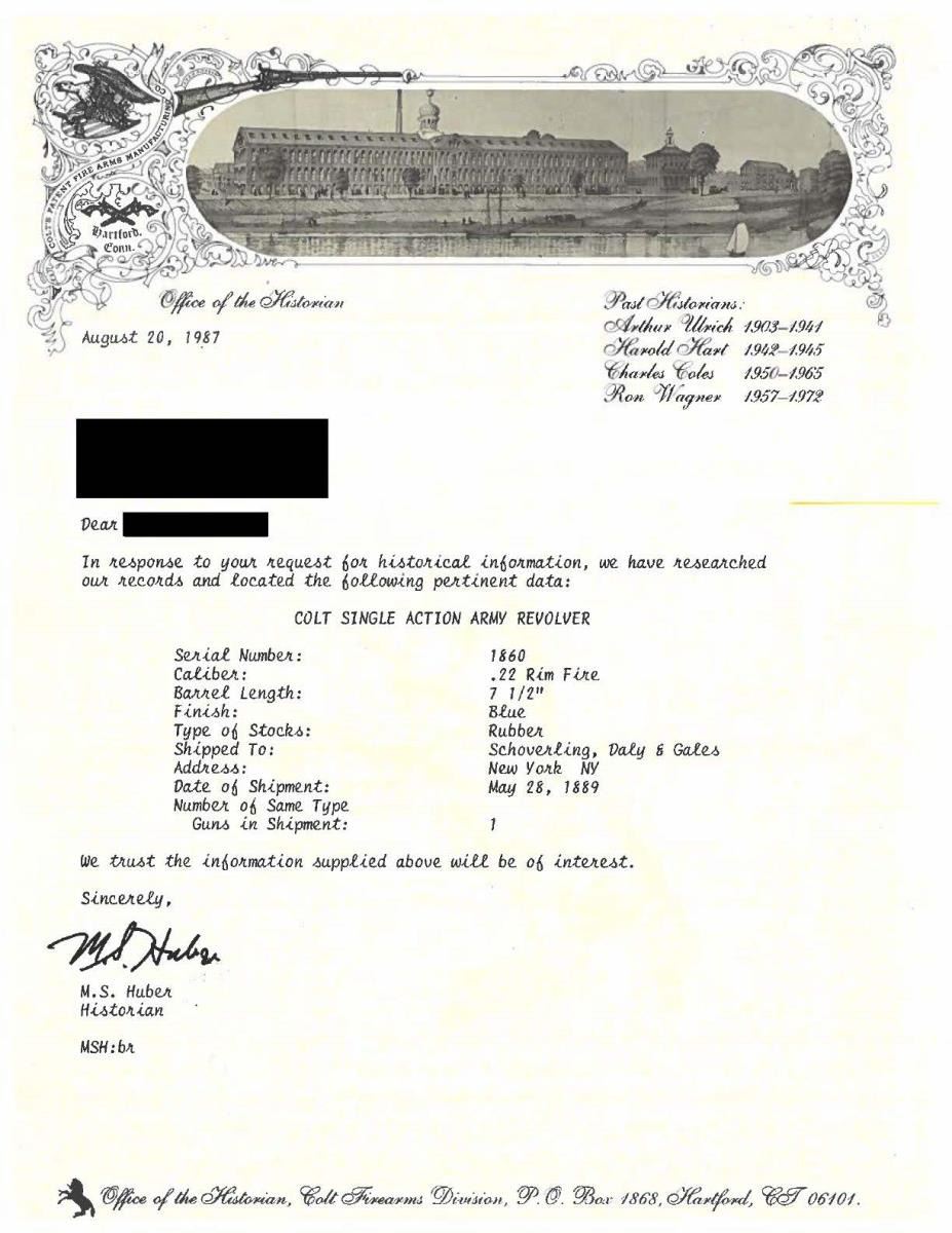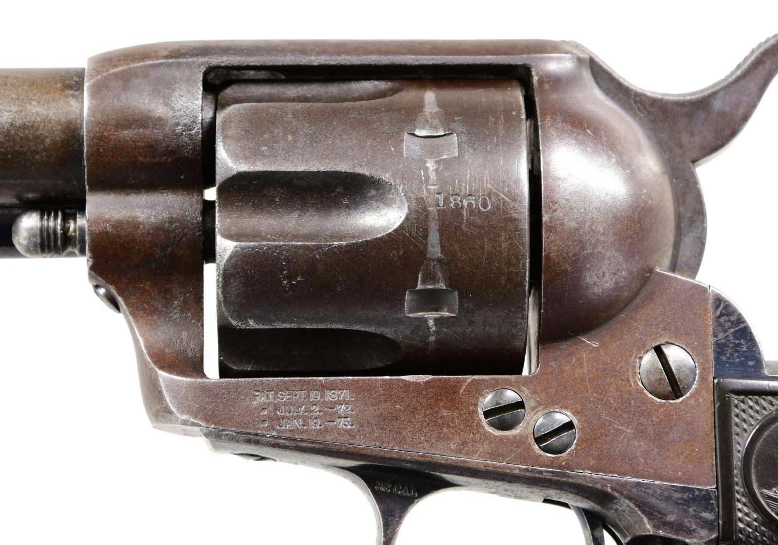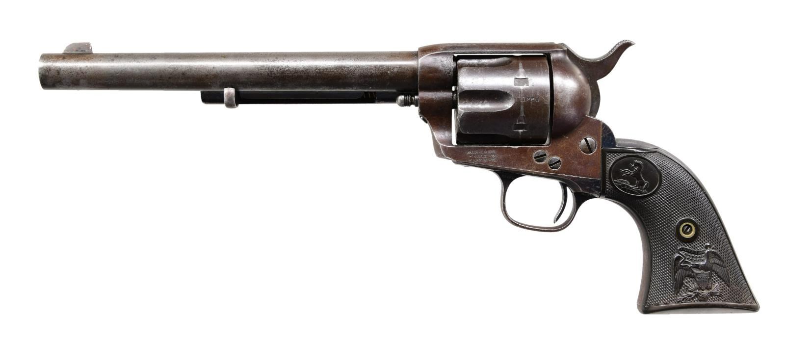 WITH FACTORY LETTER. EX FLAYDERMAN & RHOLES COLLECTIONS. Cal 22 RF. S# 1860. Bbl. 7 1/2" with correct short blade front sight. Beginning in 1875 Colt began production of the 44 RF SAA, however by this time centerfire cartridge performance had already far outpaced that of rimfire cartridges rendering SAAs chambered in 44 RF obsolete from the start and are found in the S# range 1-18XX. In an attempt to bolster sales, Colt then decided to manufacture or convert RF frames to a more desirable / saleable caliber, thus the introduction of the 22 RF to the Colt SAA line. The "solution" fell flat however and as stated in "A STUDY OF THE COLT SINGLE ACTION ARMY REVOLVER" by Graham, Kopec & Moore page 29, "In his research of Colt shipping records, John E Parsons accounted for 107 .22 caliber standard frame Single Actions. However a separation of converted .22's and regular .22 cal. production was not noted." With a meager 107 22 RF SAAs produced, this remains one of the rarest calibers in existence. Matching numbers appear on frame, cyl, grip frame & bbl. Left front of trigger guard bow marked "22 CAL" and does not appear to be an overstamp. Correct unnumbered 2 piece checkered hard rubber eagle grips. Bbl. has 1 line block letter address. Left side of frame marked with 3 line patent date. UNATTACHED ACCESSORIES: Colt factory archive letter to Norm Flayderman dated August 20, 1987 stating the following: "Serial Number: 1860/ Caliber: .22 Rim Fire/ Barrel Length: 7 1/2"/ Finish: Blue/ Type of Stocks: Rubber/ Shipped to: Schoverling, Daly & Gales/ Address: New York, NY/ Date of Shipment: May 28, 1889/ Number of Same Type Guns in Shipment: 1". CONDITION: Fine overall for RF production as few surviving examples retain any finish whatsoever. Metal components retain 20-30% original blue, notably in protected areas, butt & grip frame. Balance of metal turning gray with a pleasing brown patina. Action is also a blend of gray / patina with small areas of cleaned light pitting ahead of cyl. Hammer retains strong case colors. Grips show only light wear and fading commensurate with age. Very good bore retains strong rifling with areas of light frosting. Mechanically fine. PROVENANCE: Ex. Norm Flayderman Collection, Ex. Tommy Rholes Collection. James D. Julia past auction, March 2014. (01-25363/BH). ANTIQUE. $18,000-27,000.