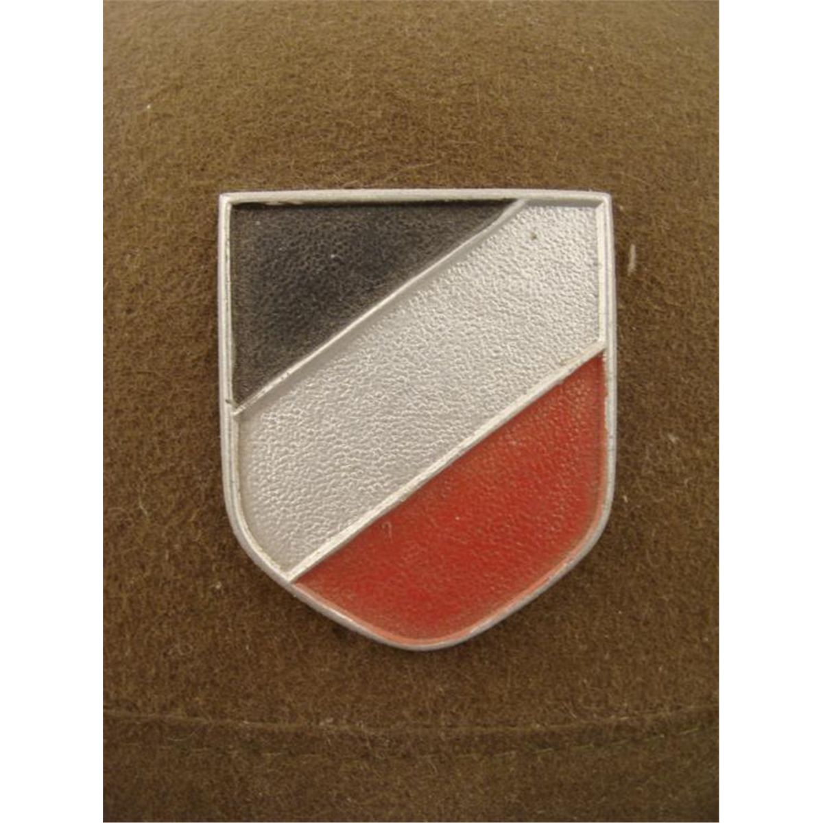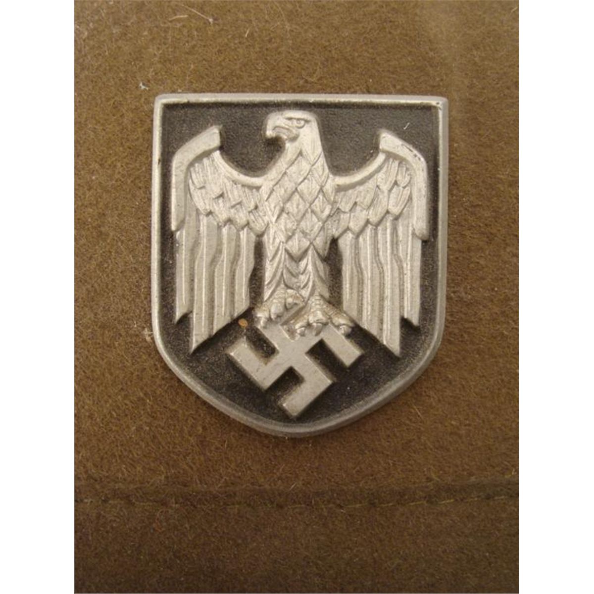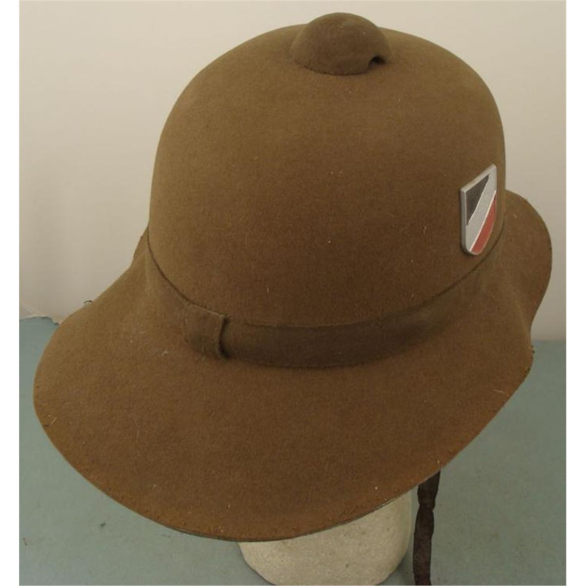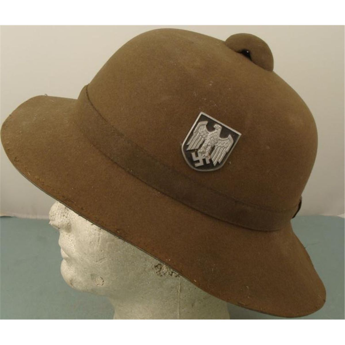 THIS IS A RARE, ORIGINAL NAZI AFRIKA KORPS PITH HELMET WITH BOTH SHIELDS, FELT AND WOOL TYPE. A GUARANTEED ORIGINAL VET BRINGBACK NAZI AFRICA CORPS AK MILITARY WEHRMACHT PITH HELMET. IT IS BROWN FELT WITH AN AIR BUTTON ON TOP. IT HAS BOTH ORIGINAL SHIELDS, EAGLE & SWASTIKA AND A TRI-COLORED SHIELD. THE INSIDE IS FINE EXCEPT THERE ARE A FEW MOTH NIPS, A LEATHER SWEATBAND AND CHINSTRAP DAMAGE. ALSO THE LEATHER EDGE TRIM ON THE HELMET IS NOT PRESENT. THIS IS ONE RARE NAZI HELMET THAT IS RARELY SEEN FOR SALE ANYMORE.