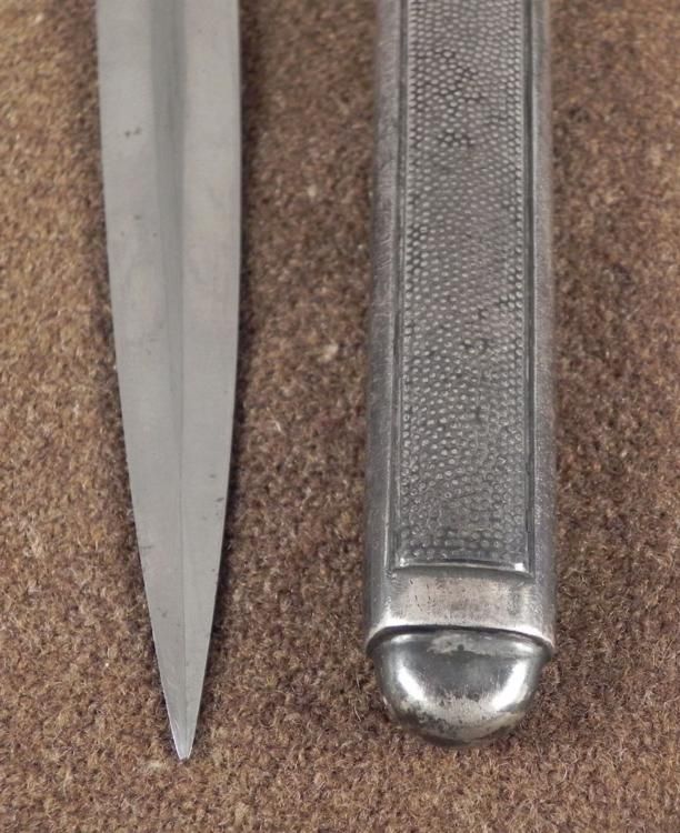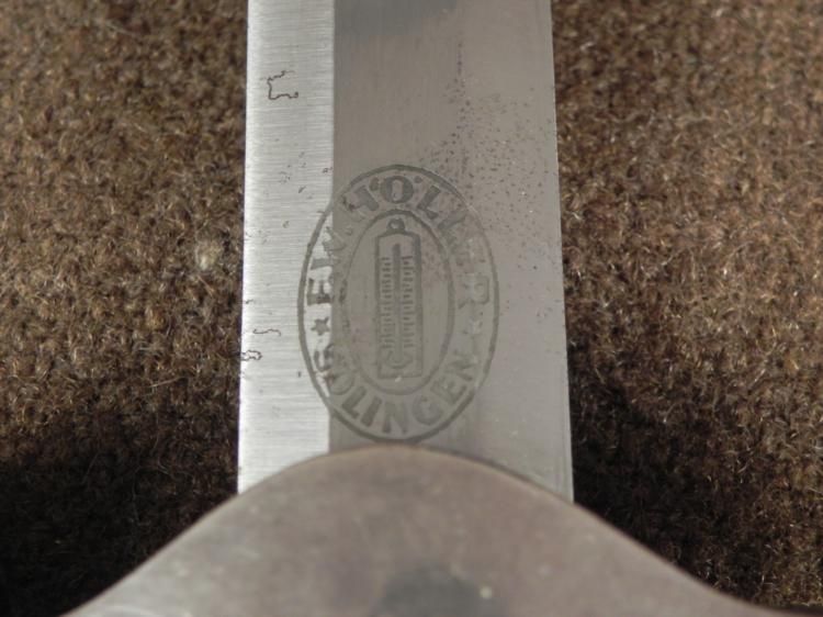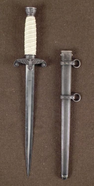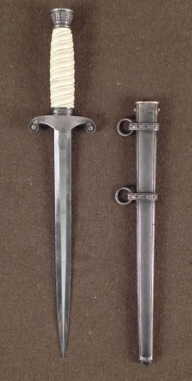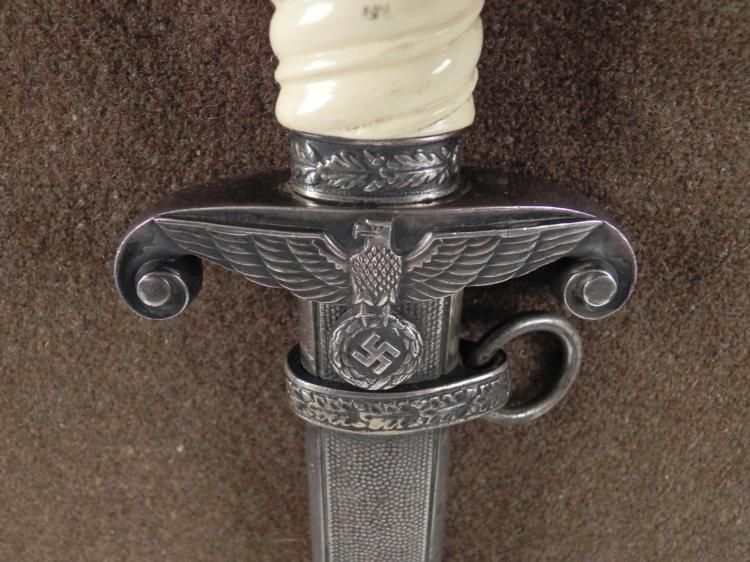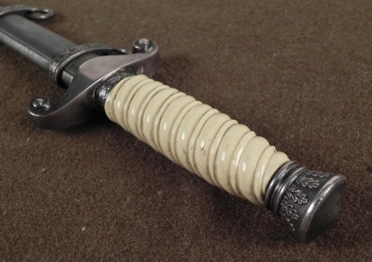 HERE IS AN OUTSTANDING ORIGINAL NAZI WEHRMACHT/ARMY OFFICER'S NAZI DAGGER. THIS EXTREMELY RARE ORIGINAL NAZI WEHRMACHT OFFICER'S DAGGER IS IN EXCELLENT CONDITION. IT IS A BEAUTIFUL BLADE WITH NO DENTS, SCRATCHES, OR DINGS TO IT. THE CROSSGRAIN IS VISIBLE WITH A NICE DEEP MAKER LOGO ON THE RICASSO, "F.W. HOLLER-SOLINGEN" WITH A THERMOMETER MAKER LOGO. THE EAGLE & SWASTIKA CROSS GUARD IS GREAT WITH MUCH DETAIL AND BURNISHED HIGHLIGHTING. THE DAGGER HAS AN OFF WHITE IVORY TYPE GRIP. IT HAS A NICE POMMEL WITH OAK LEAVES, NICE PATINA AND HIGHLIGHTS. THE DAGGER HAS A GREAT SCABBARD AND IS CORRECT IN EVERY WAY WITH A NICE PATINATION. THE BUFFER IS STILL INSET IN THE CROSS GUARD. THIS IS THE BEST ORIGINAL YOU WILL SEE! IT WILL BE THE PRIDE OF YOUR COLLECTION!! *